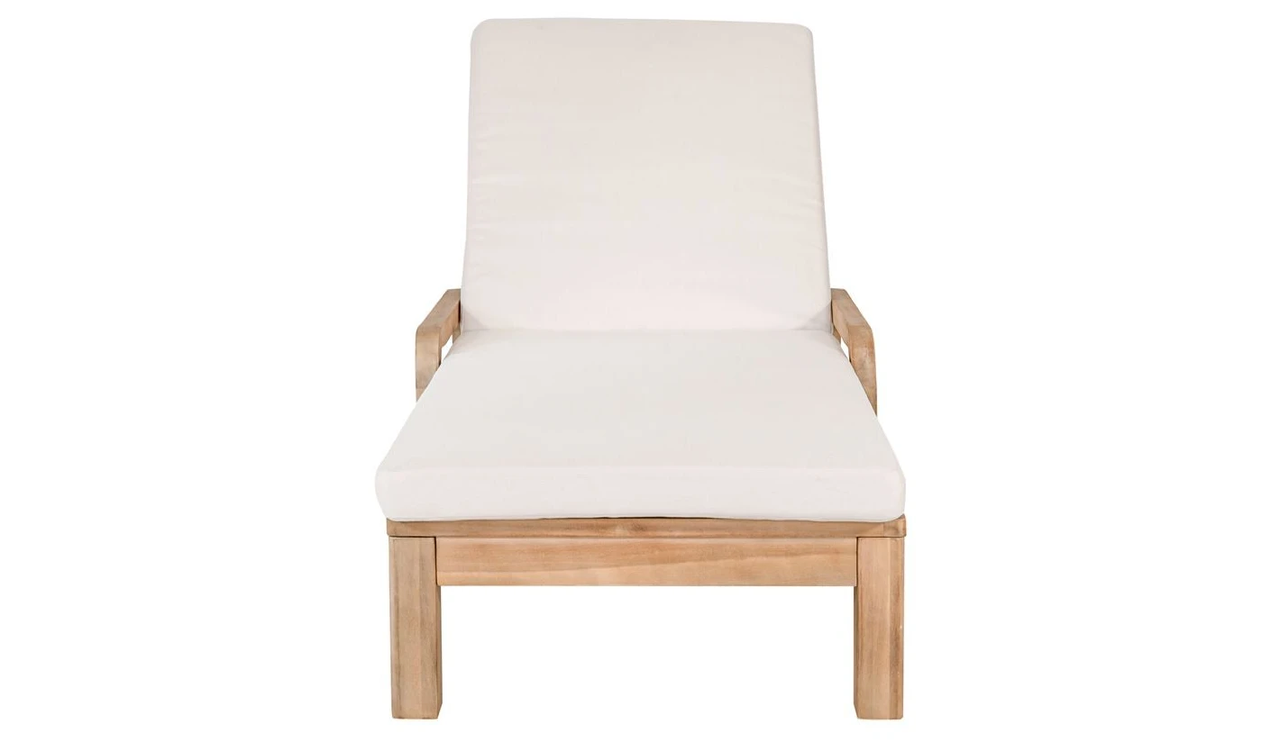 Tumbona de madera de acacia para exterior de alta densidad con cojines de poliéster en color beige de 6 cm de grosor.
