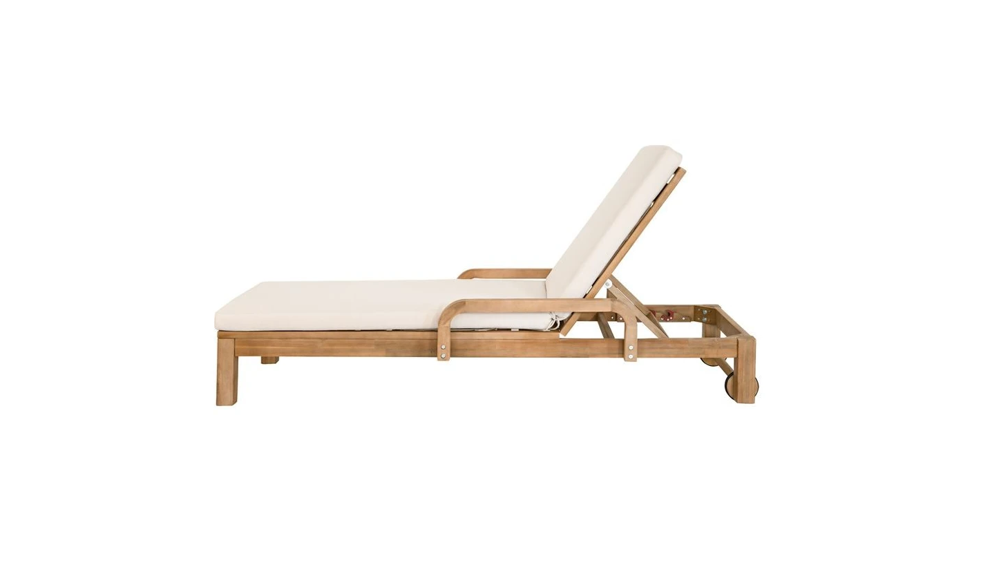 La superficie de descanso está equipada con un cojín de microfibra de color blanco crudo, que aporta una textura suave y una resistencia superior al desgaste y a la decoloración. El respaldo ajustable asegura una experiencia de relajación personalizada, ideal para disfrutar del sol o de una siesta al aire libre. Además, está equipada con ruedas discretas que facilitan su movilidad y permiten cambiar la orientación con el sol sin esfuerzo.