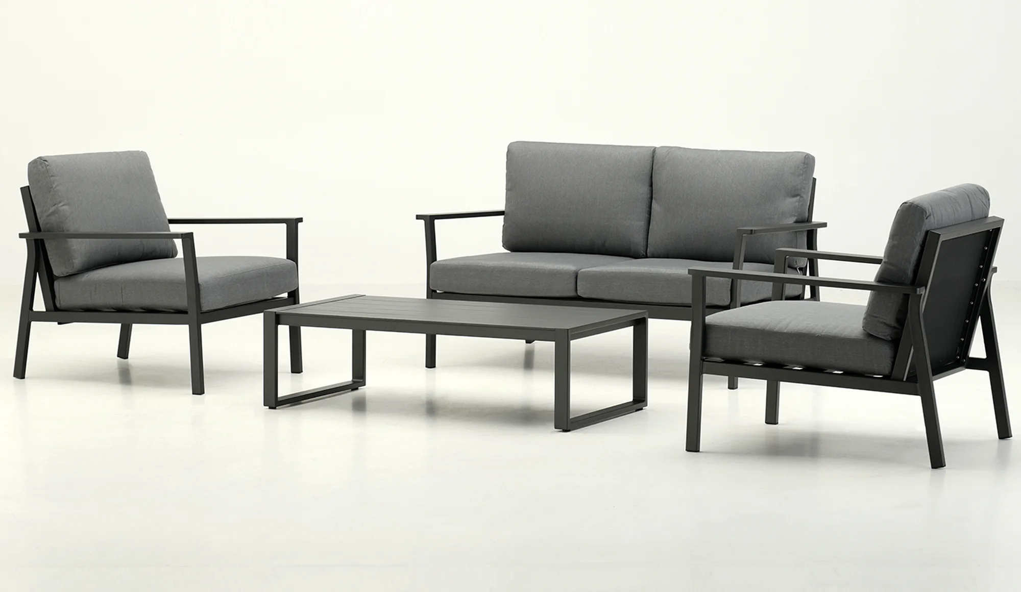 Set con estructura de aluminio en color antracita y cojines en color gris en Spunpoly