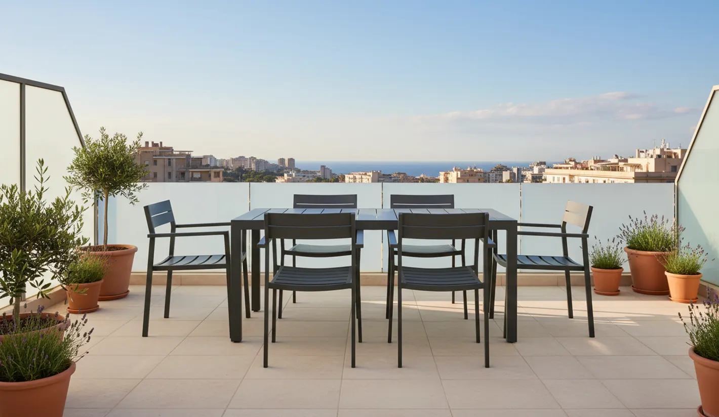 Este conjunto de muebles de jardín presenta un diseño contemporáneo, ideal para espacios exteriores residenciales modernos. La mesa, con dimensiones de 162 cm de largo, 80 cm de ancho y 74 cm de alto, cuenta con un tablero de listones rectangulares de aluminio que ofrecen una estética minimalista y funcional. Su color gris antracita proporciona una imagen sofisticada y versátil.