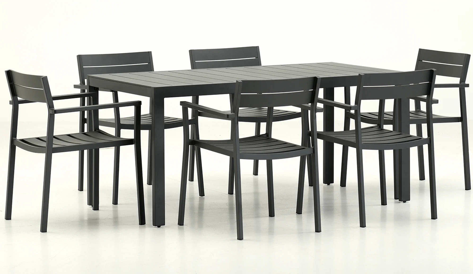 Las seis sillas a juego incluidas en el set, de 81 cm de altura, tienen un diseño ergonómico con respaldos ligeramente inclinados y asientos de listones que garantizan confort y durabilidad. El material, de aluminio de alta resistencia, es adecuado para el uso continuo y su exposición a los elementos.