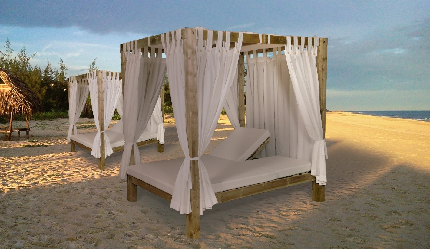 Cama balinesa de exterior de madera autoclave con respaldo reclinable.