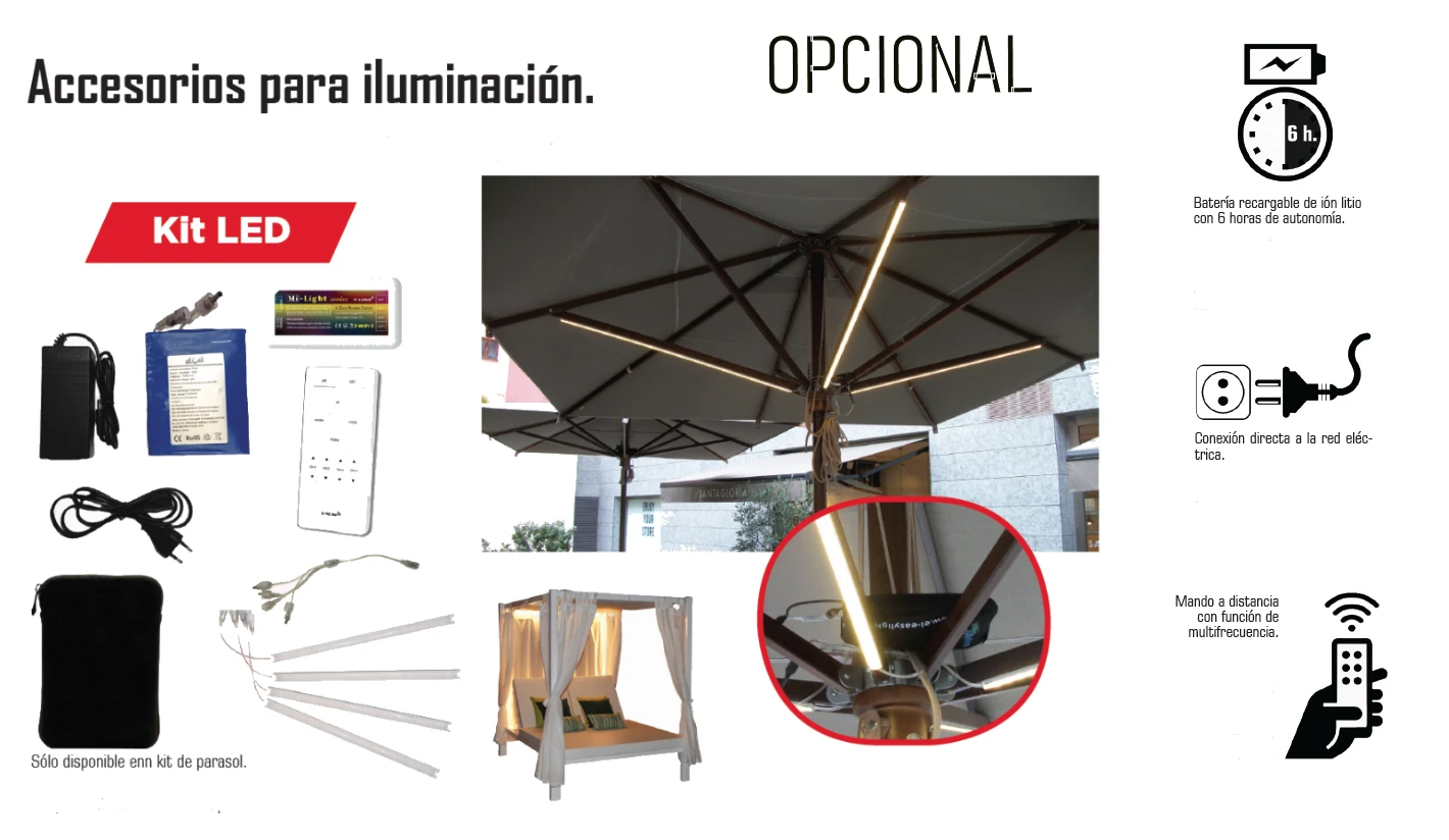 Opcionalmente se puede incluir luz mediante tira Led con o sin RGB, añadiendo 3 tiras de 148cm, que se pueden alimentar por bateria o directamente a la corriente.