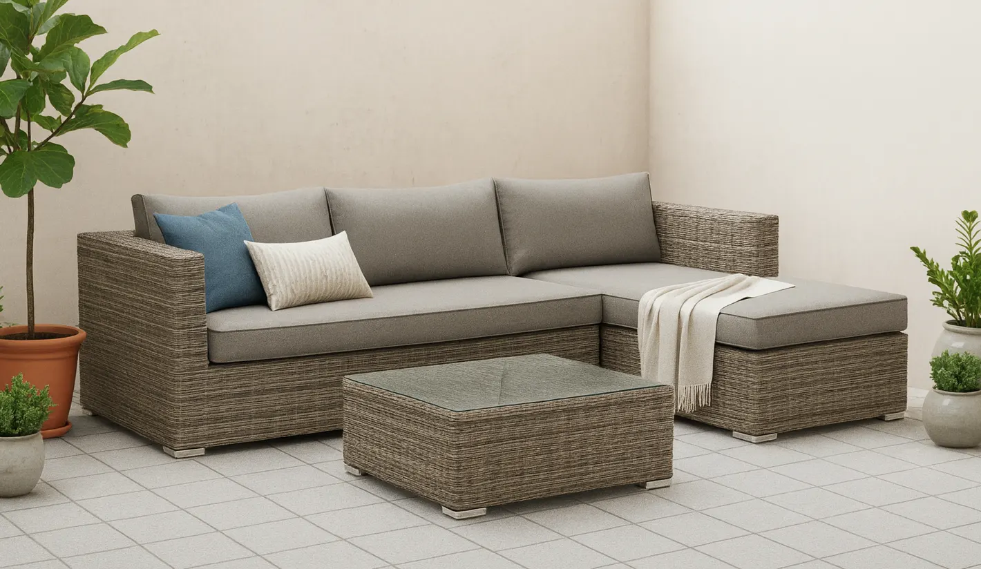 Set compuesto por 3 piezas, correspondientes a un sofá de 2 plazas, una chaise longue y una mesita.