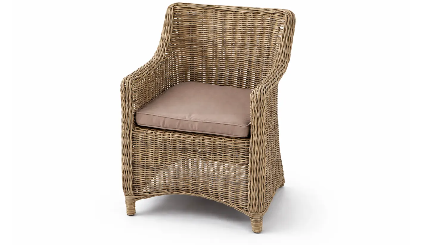 Sillones con estructura de aluminio recubierto de ratán cicular en color natural y cojín color taupé