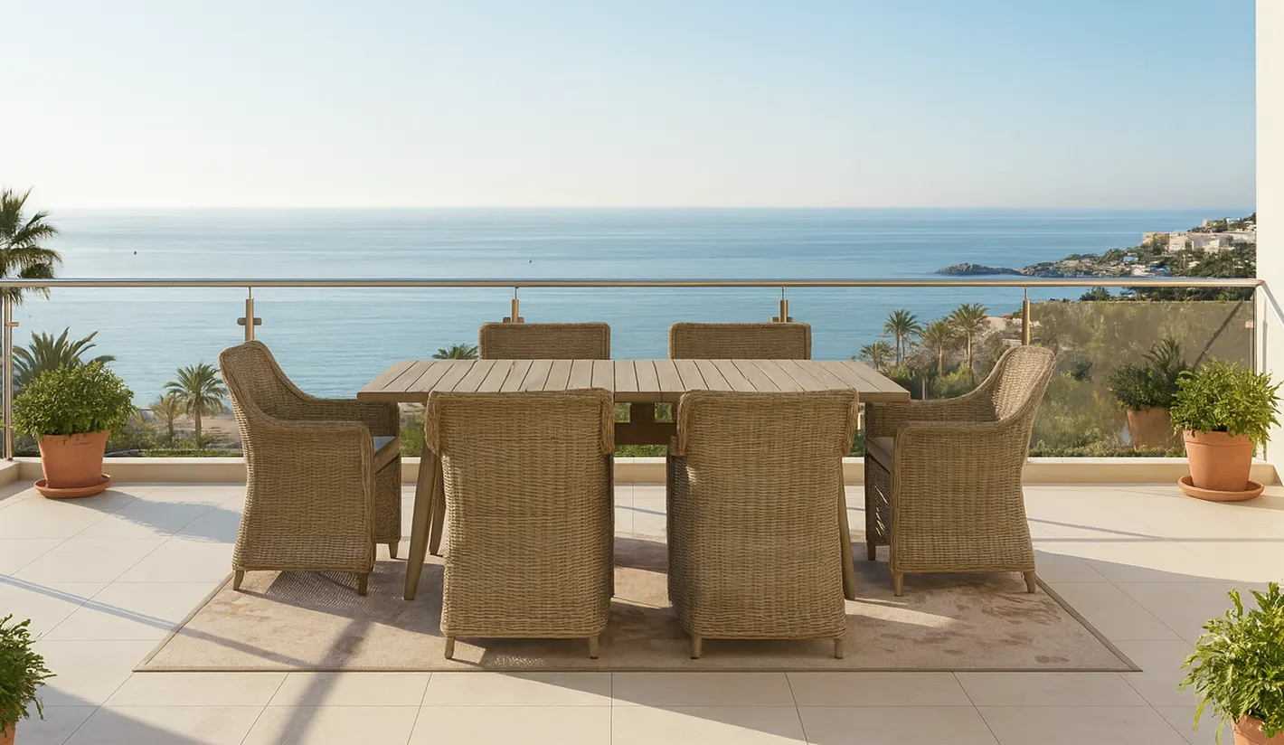 Mesa de acacia totalmente para el exterior, poco mantenimiento y alta resistencia.