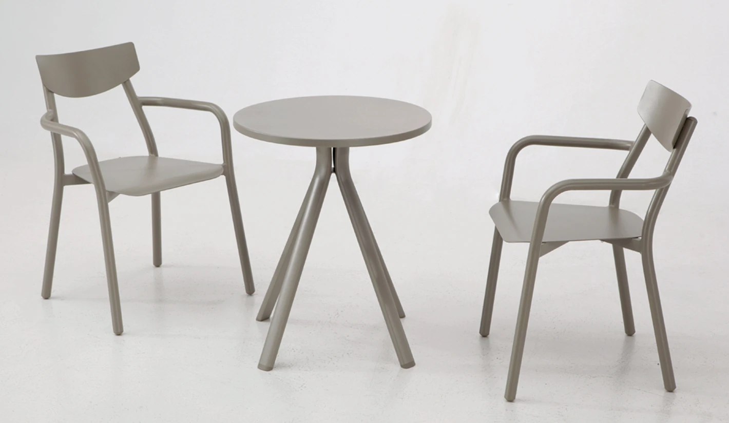 Ver descripción de la colecciónColección de aluminio disponible en dos colores con opción de mesa pequeña redonda o cuadrada.
