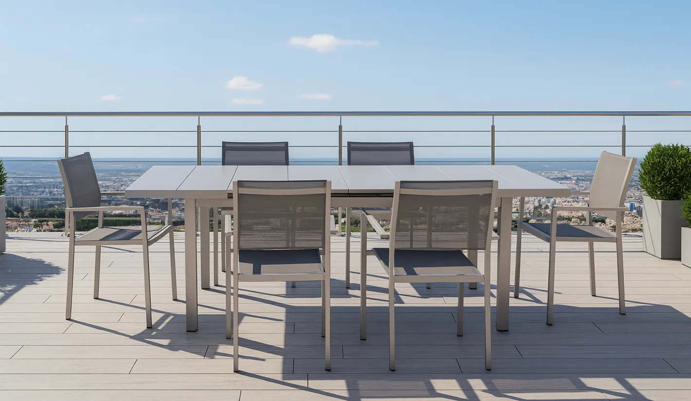 Mesa extensible para 4 o 6 comensales de aluminio imitando al acero