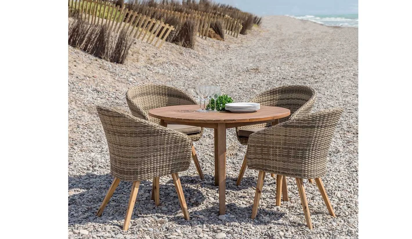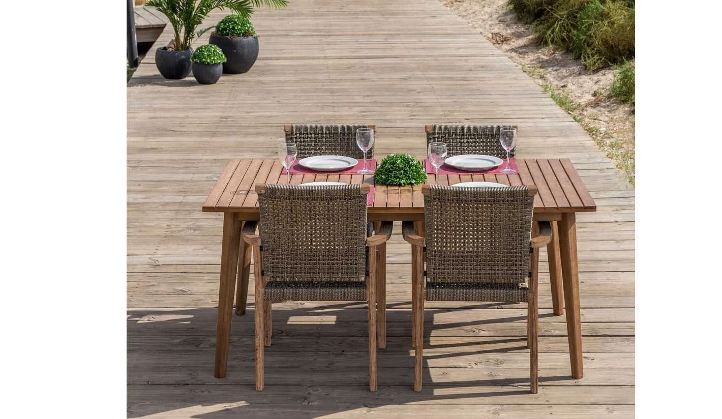 Ver descripción de la colecciónColección de comedor exterior de acacia maciza, tratada con aceite de teca y lavada con cera.