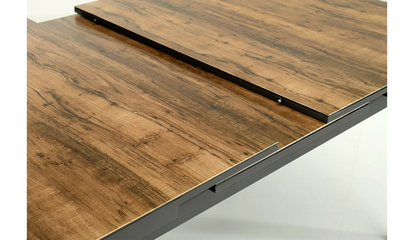 Ver descripción de la colecciónMesa muy elegante con sobre de cristal cerámico imitando a la madera, con un grosor de 0,5 mm