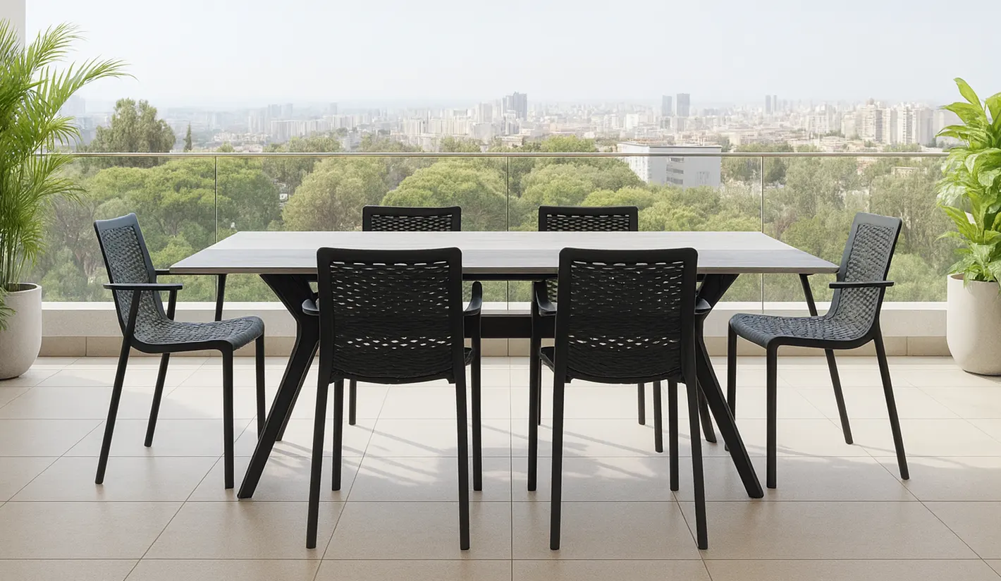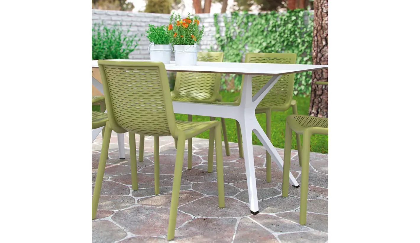 Los pies centrales son ideal para no molestar a los comensales, ya que la estructura permite pasar alrededor de la mesa sin que molesten los pies, haciendo esta mesa ideal para espacios reducidos como balcones o terrazas.