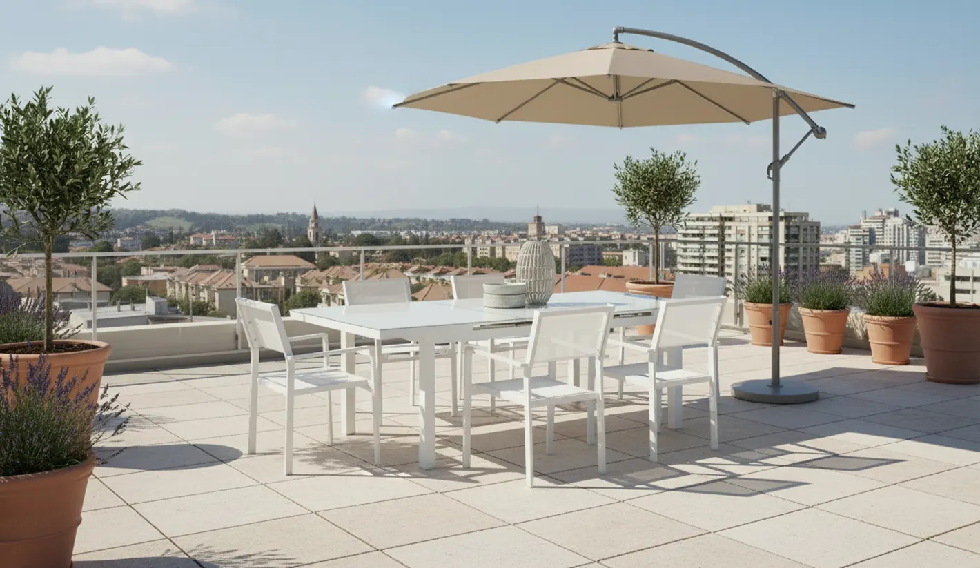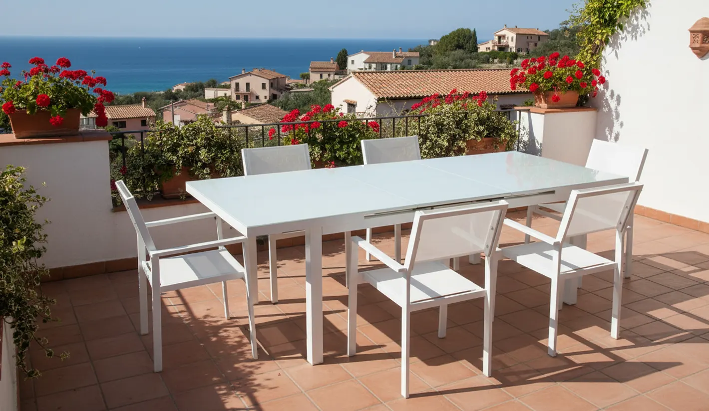 Mesa de exterior y terraza ampliable. Mesa de alumnio lacado en blanco y cristal