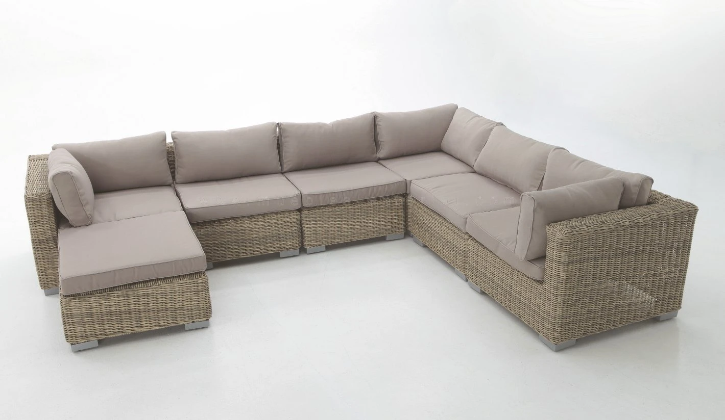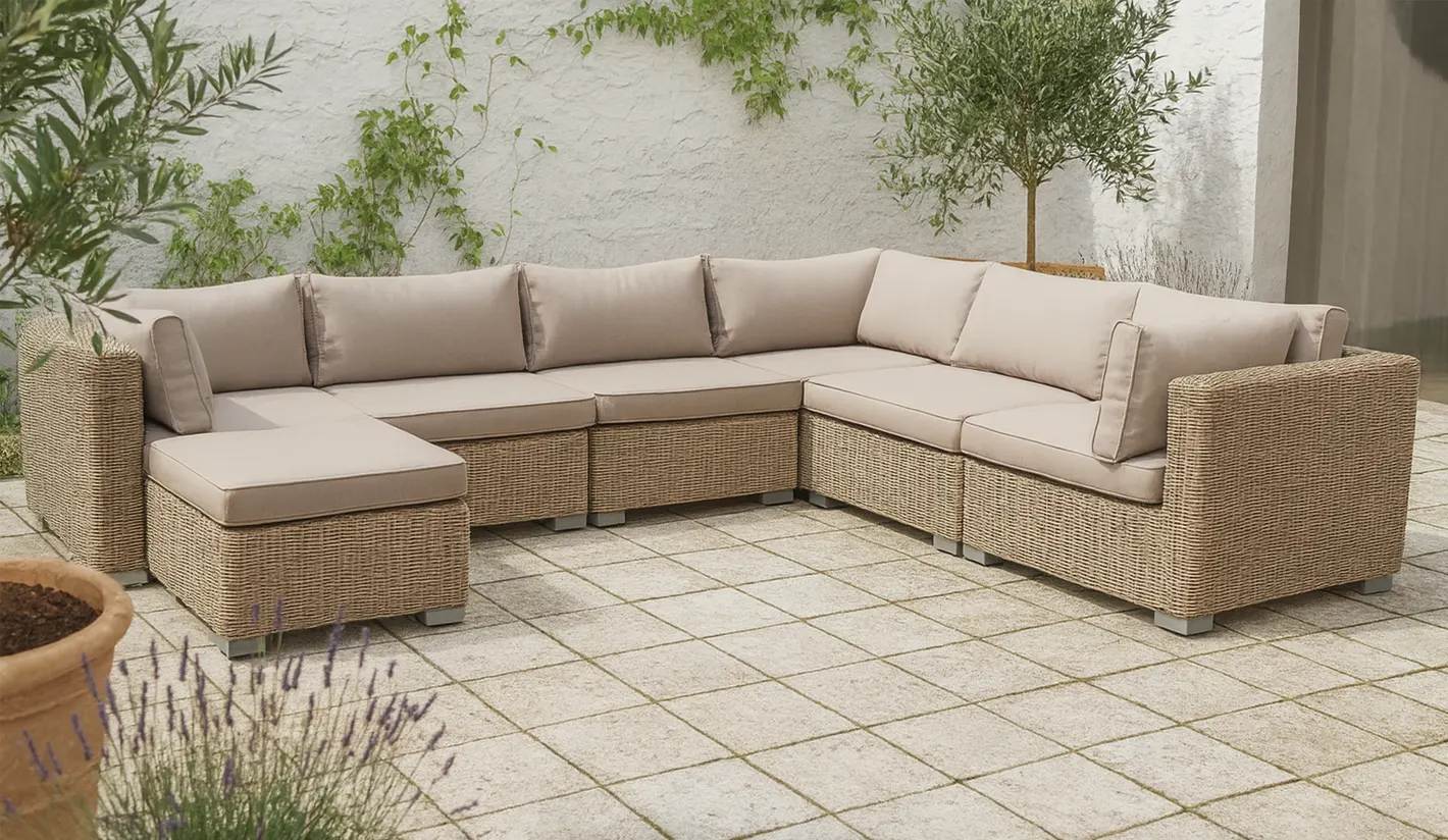 Mobiliario jardin Modular que combina el look natural del rattán con la resistencia al exterior haciendo énfasis en el diseño del mueble y utilizando cojines con la densidad idónea para ofrecer un mueble de exterior de comodidad superlativa.