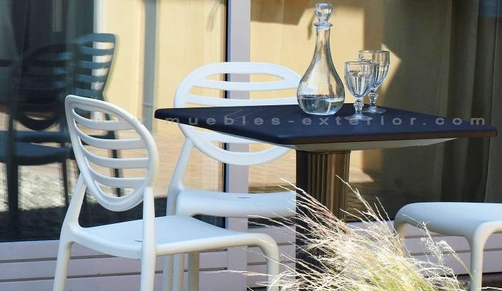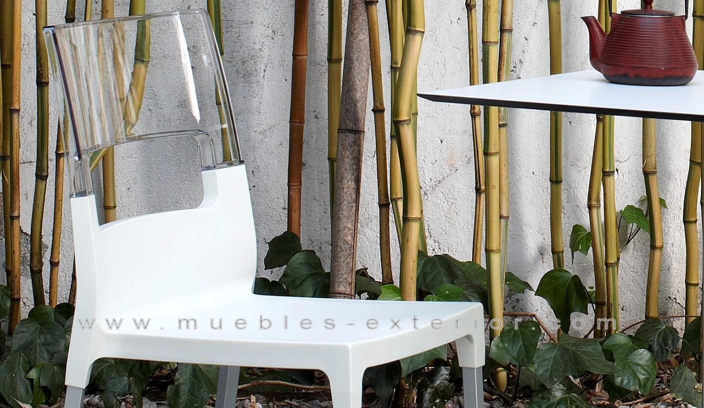 Sillas de exterior fabricadas en resina en varios colores y diseños. Se pueden combinar con cualquier mesa.