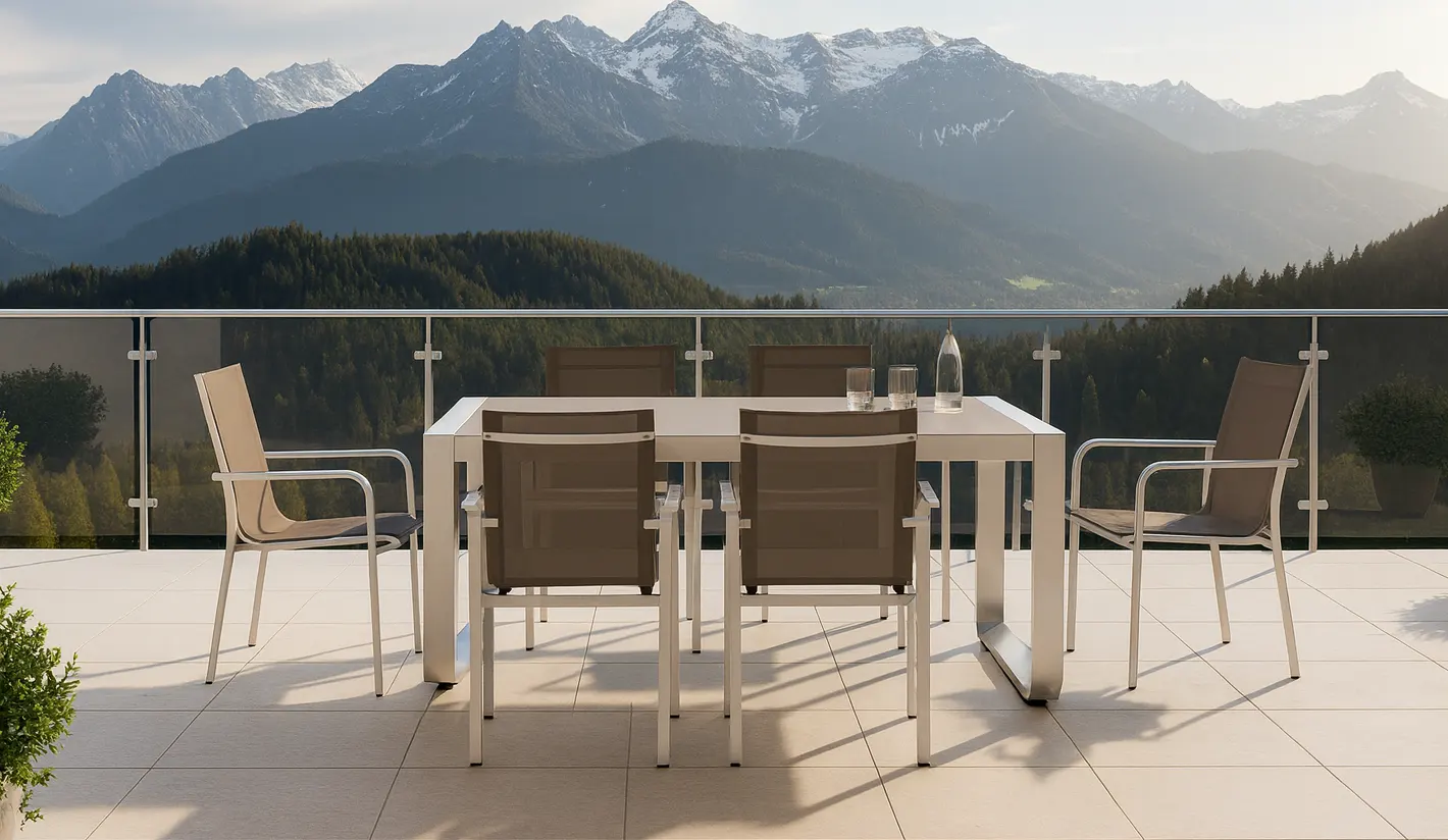 Ver descripción de la colecciónDisfruta del equilibrio perfecto entre diseño moderno, resistencia y confort con esta elegante colección de comedor para exterior. Su estructura está fabricada en aluminio anodizado, un material ligero, duradero y anticorrosivo, ideal para resistir la intemperie sin perder su brillo ni su solidez.
