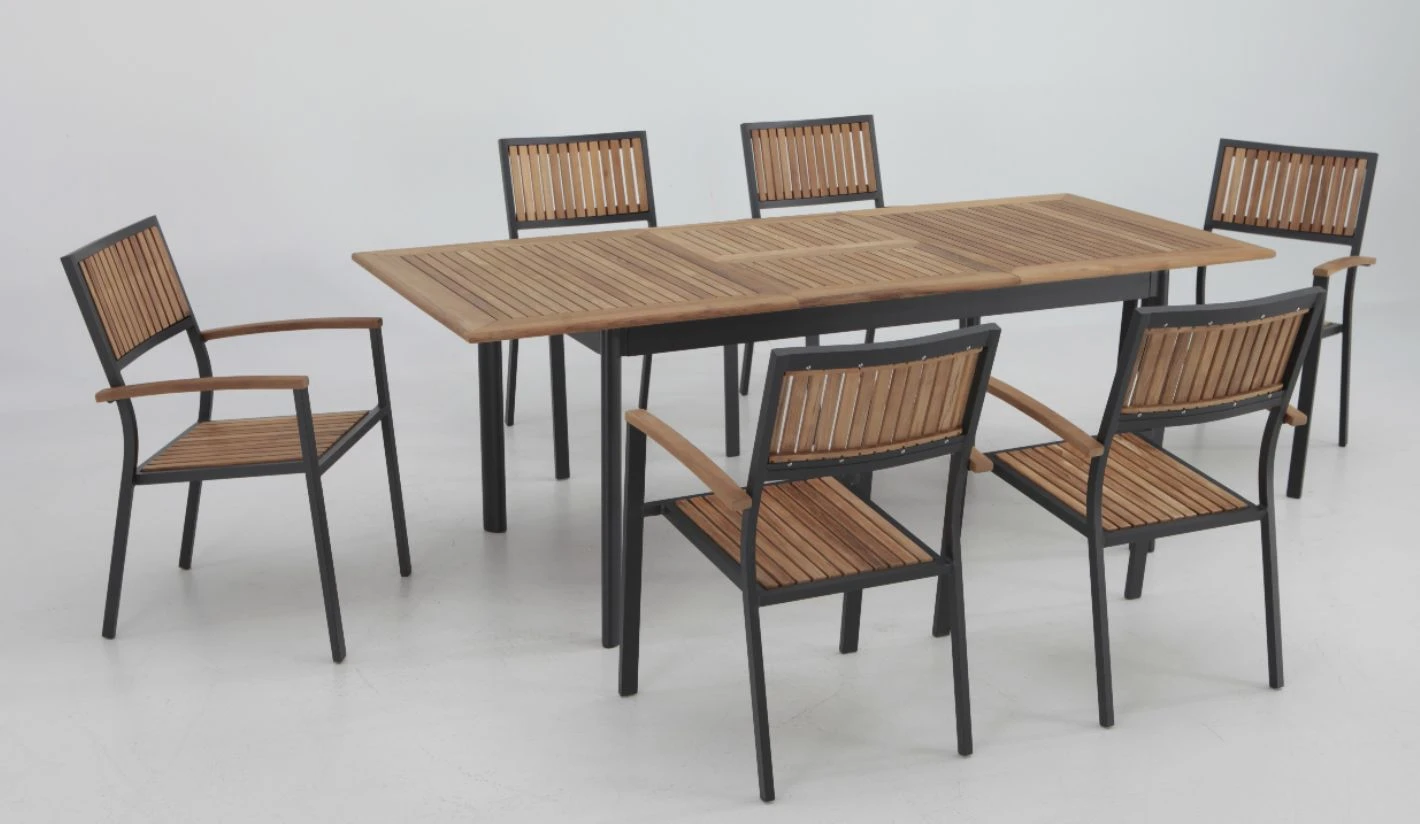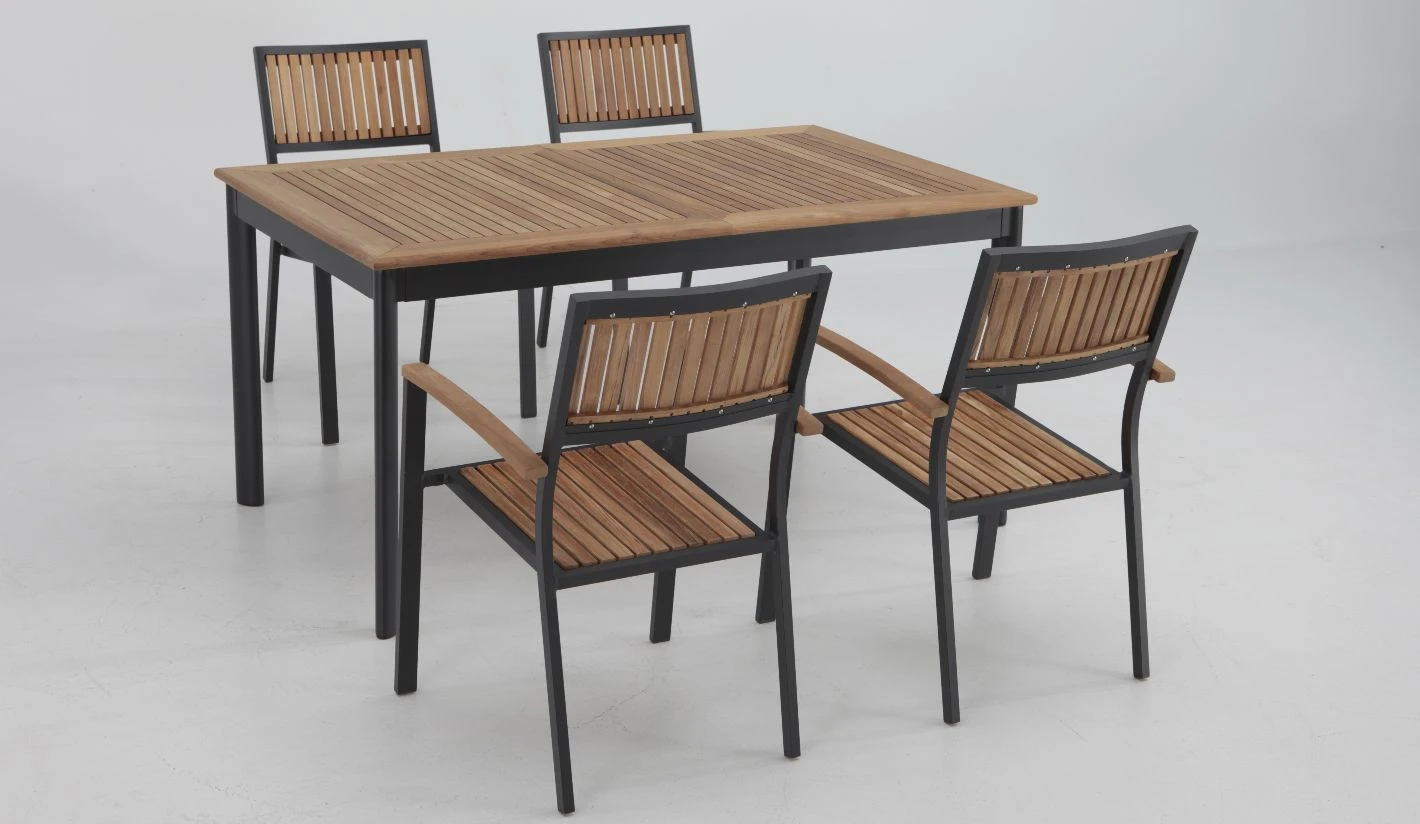 Ver descripción de la colecciónConjunto de sillas y mesas de jardín con estructura de aluminio y de teca en color antracita.