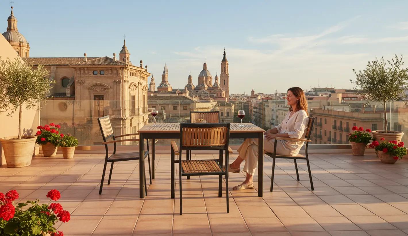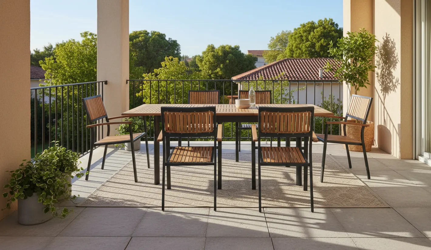 Conjunto para hasta 6 comensales, totalmente para el exterior y con protección a los rayos UV.