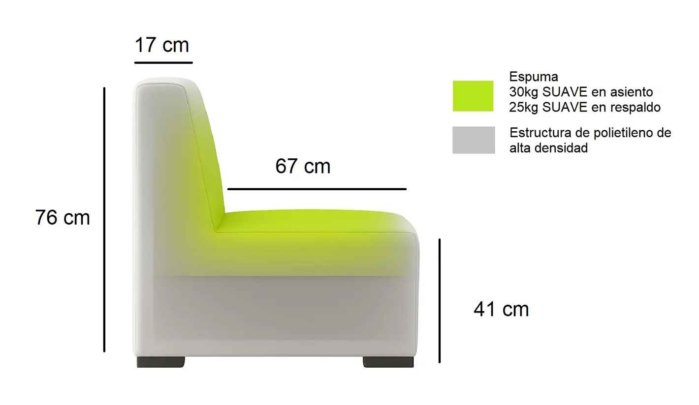 - Muebles con estructura interna general de poliestireno (EPS), material que no se pudre y altamente resistente al exterior, junto con espumas de exterior tanto en asiento como en respaldo de alta calidad, 30 kg de densidad y dureza suave