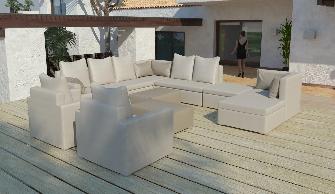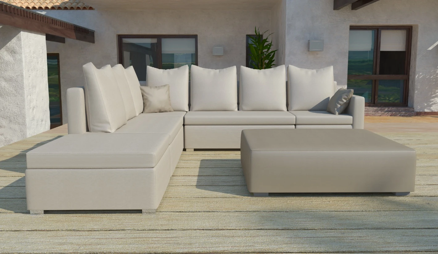 Los sofás de jardín de esta colección tiene un sistema de drenaje único que permite la evación del agua de la lluvia sin que ésta se quede estancada en el mueble. Además, los cojines también disponen de una malla microperforada en su parte inferior que permite su ventilación y secado, en el caso en que entre agua dentro del cojín. De no llevar esta malla microperforada, el agua de la lluvia que puede entrar por costuras y cremalleras, se quedaría estancada dentro del cojín.