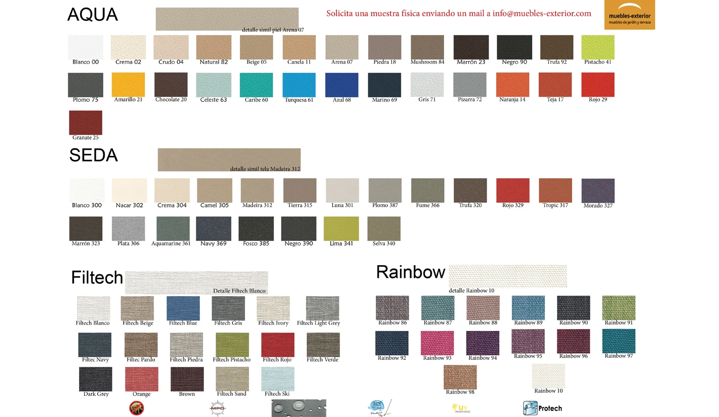 Tan solo nos tiene que mandarnos un email detallando los colores de telas impermeables que quiere recibir como muestra. Le enviaremos muestras de las telas en los colores que nos solicite. Envienos un email detallando su nombre, dirección y los colores que quiere recibir a:info@muebles-exterior.com