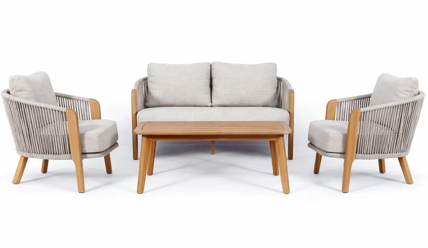 Ver descripción de la colecciónConjunto lounge de exterior en madera y cuerda trenzada con cojines beige claro