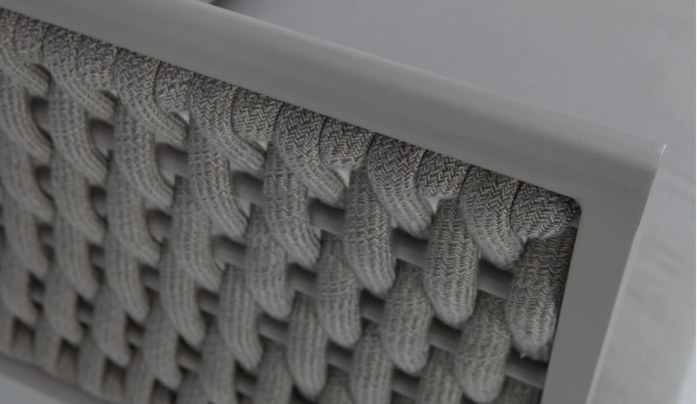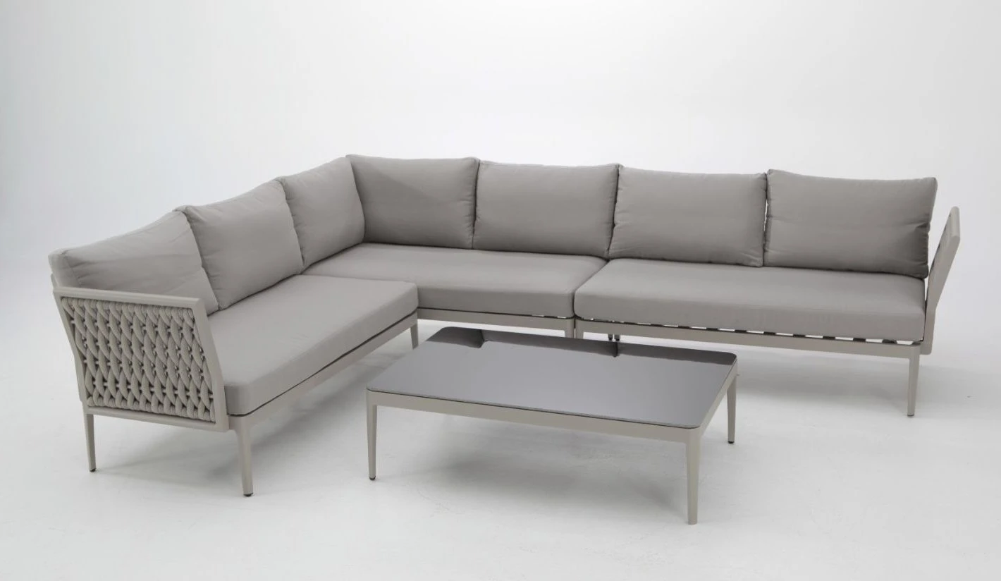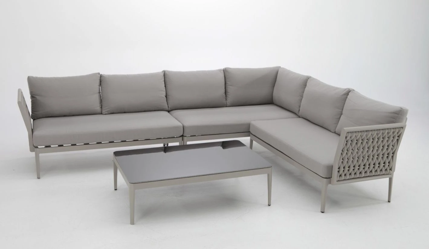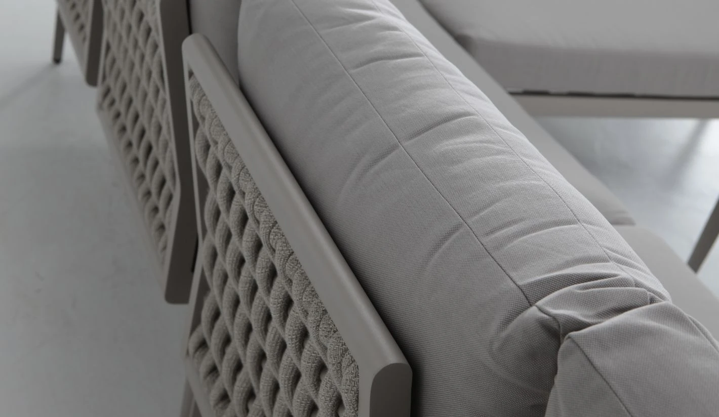 La estructura es de aluminio en color Taupé, combinadas con unas cintas de cuerda color beige, todo en tejido acrilico especialmente diseñado y tratado para el exterior.