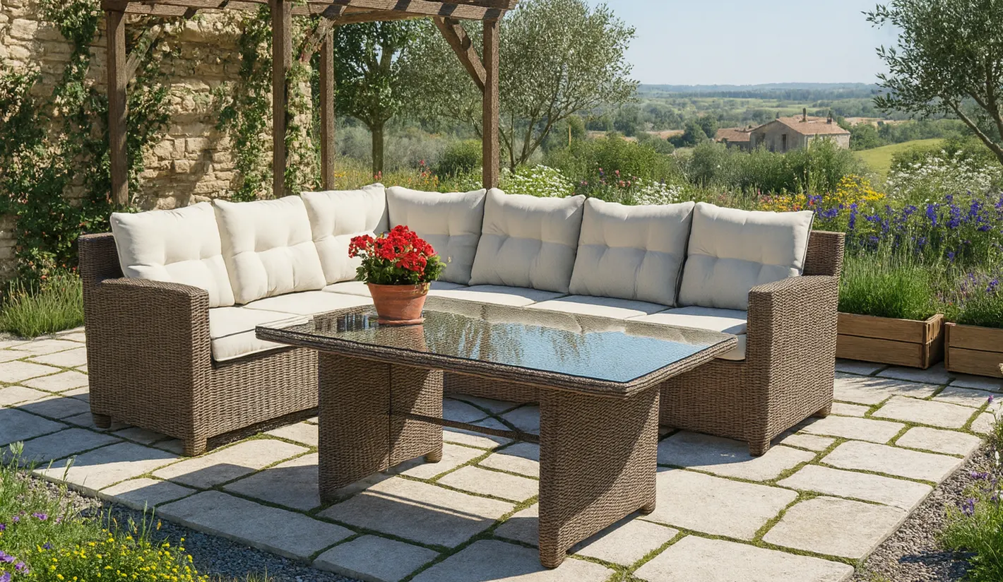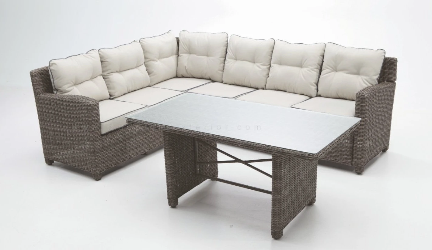 Este sofá de jardín modular para comedor porporciona toda la comodidad de un sofá de jardín de estar, pero con las medidas de altura ideales para poderse sentar a la mesa.