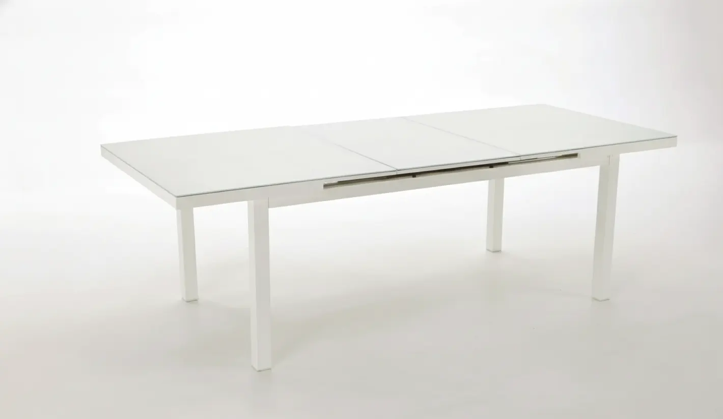 Fabricada con estructura de aluminio lacado en blanco y sobre de cristal.