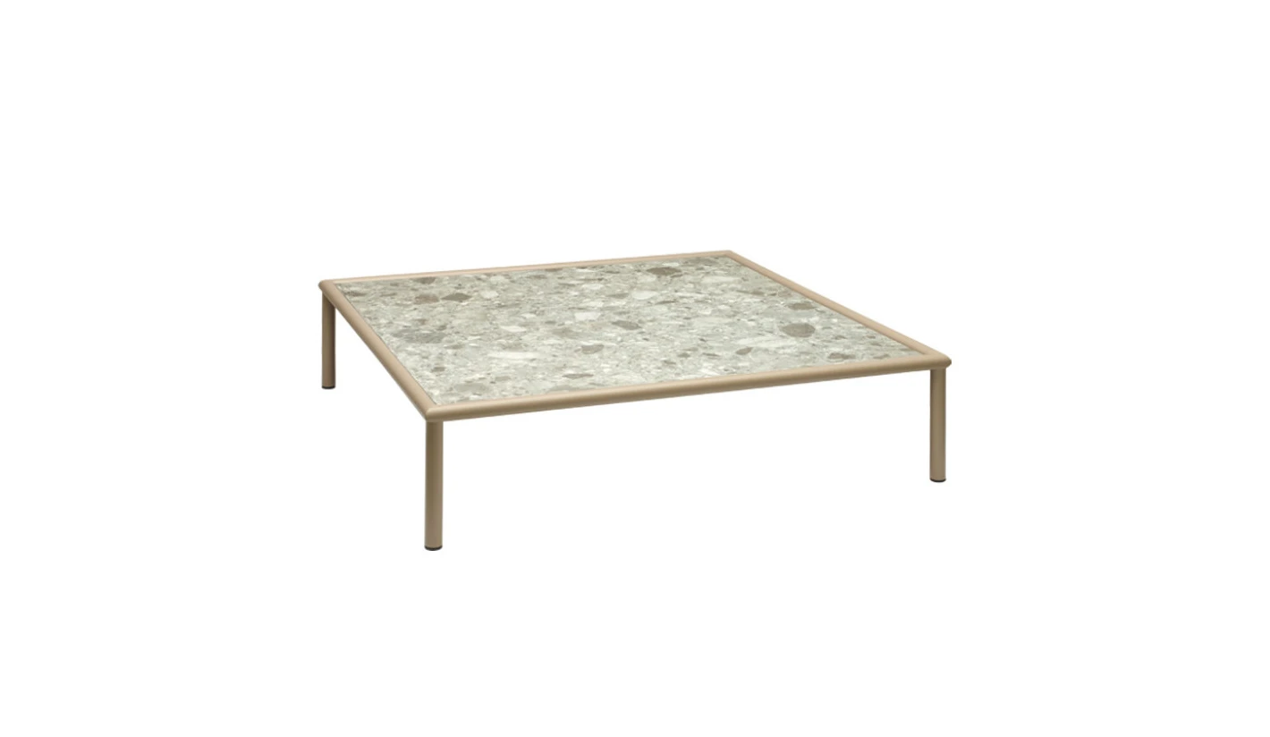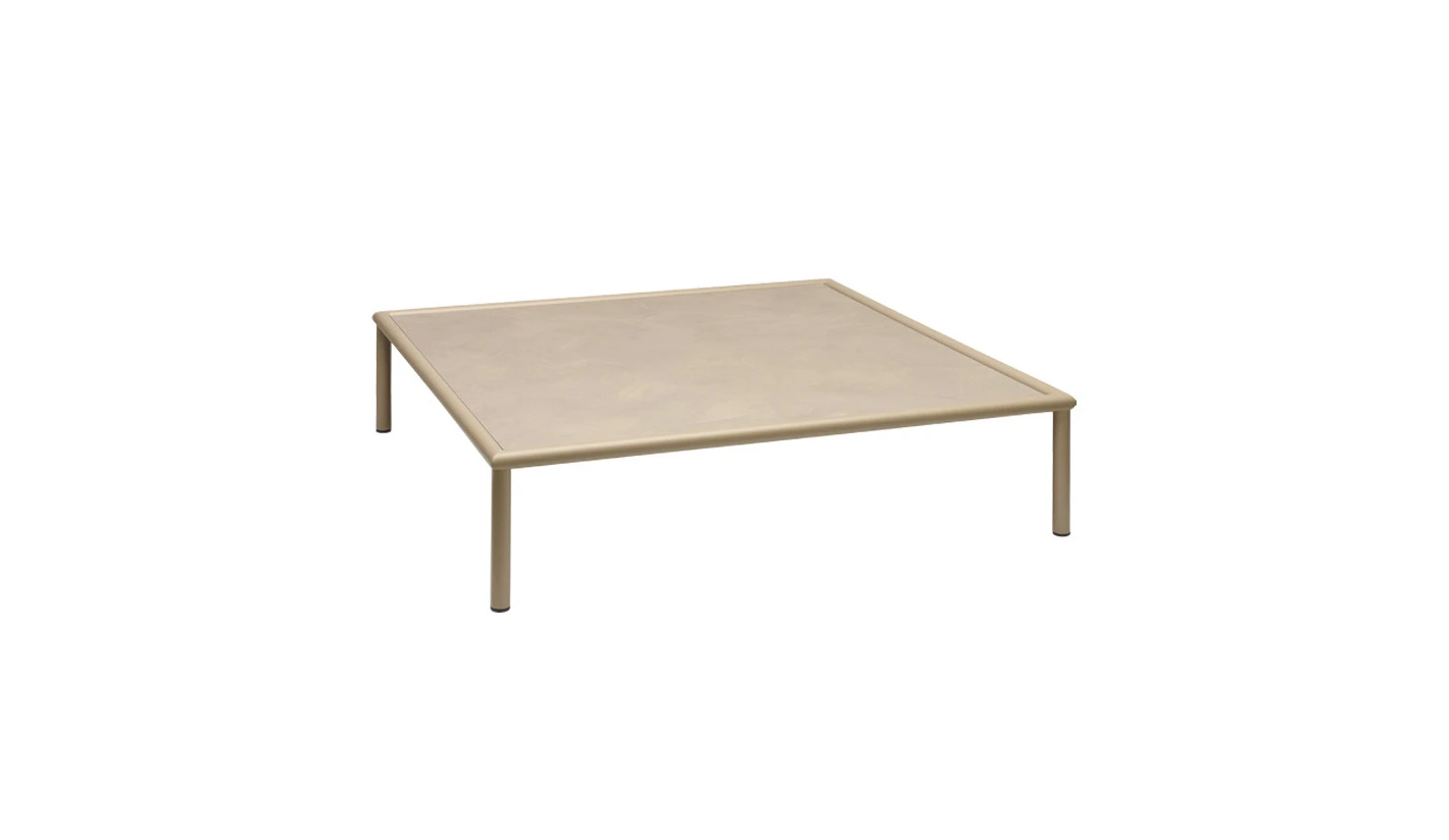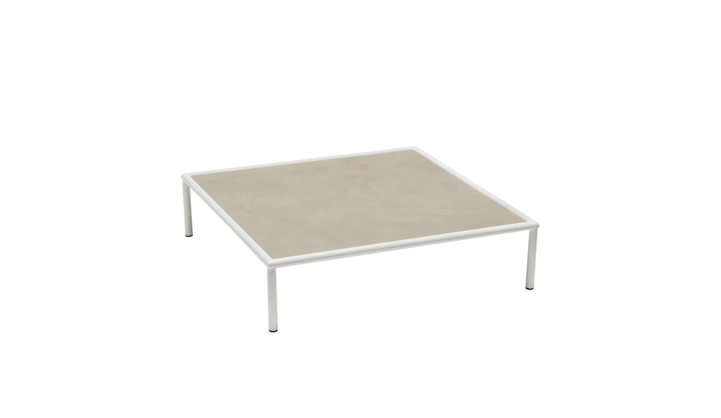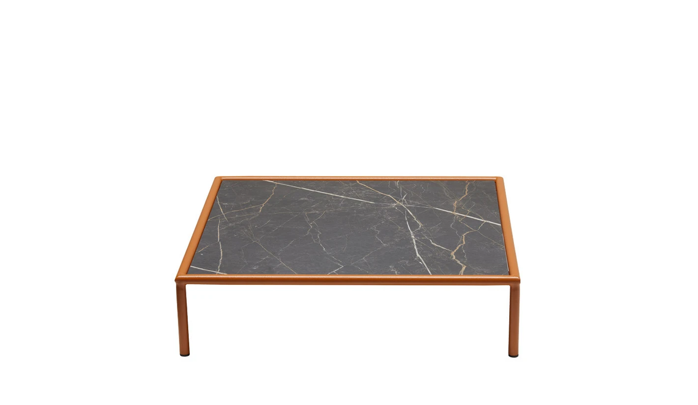 Mesita de centro en compacto HPL con estructura de acero totalmente para el exterior.