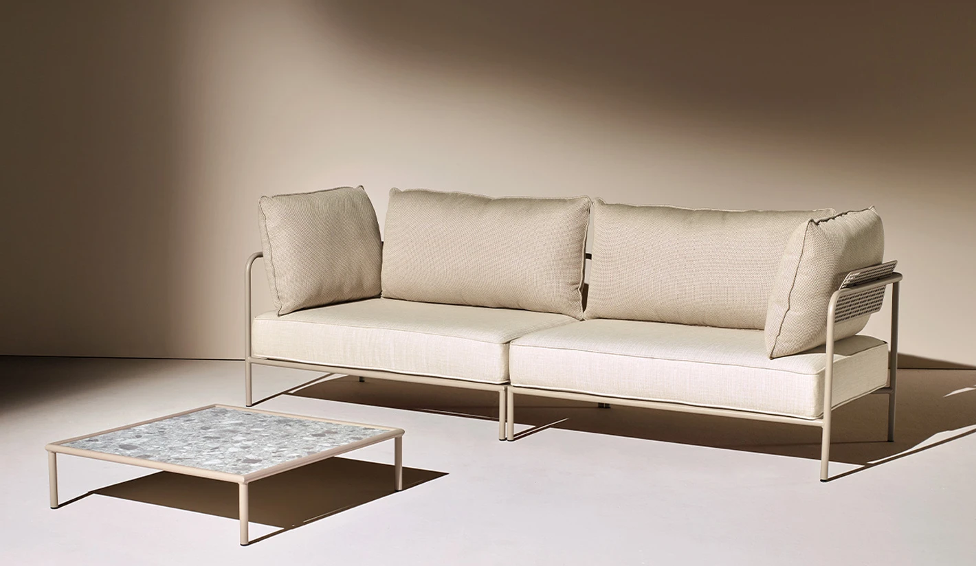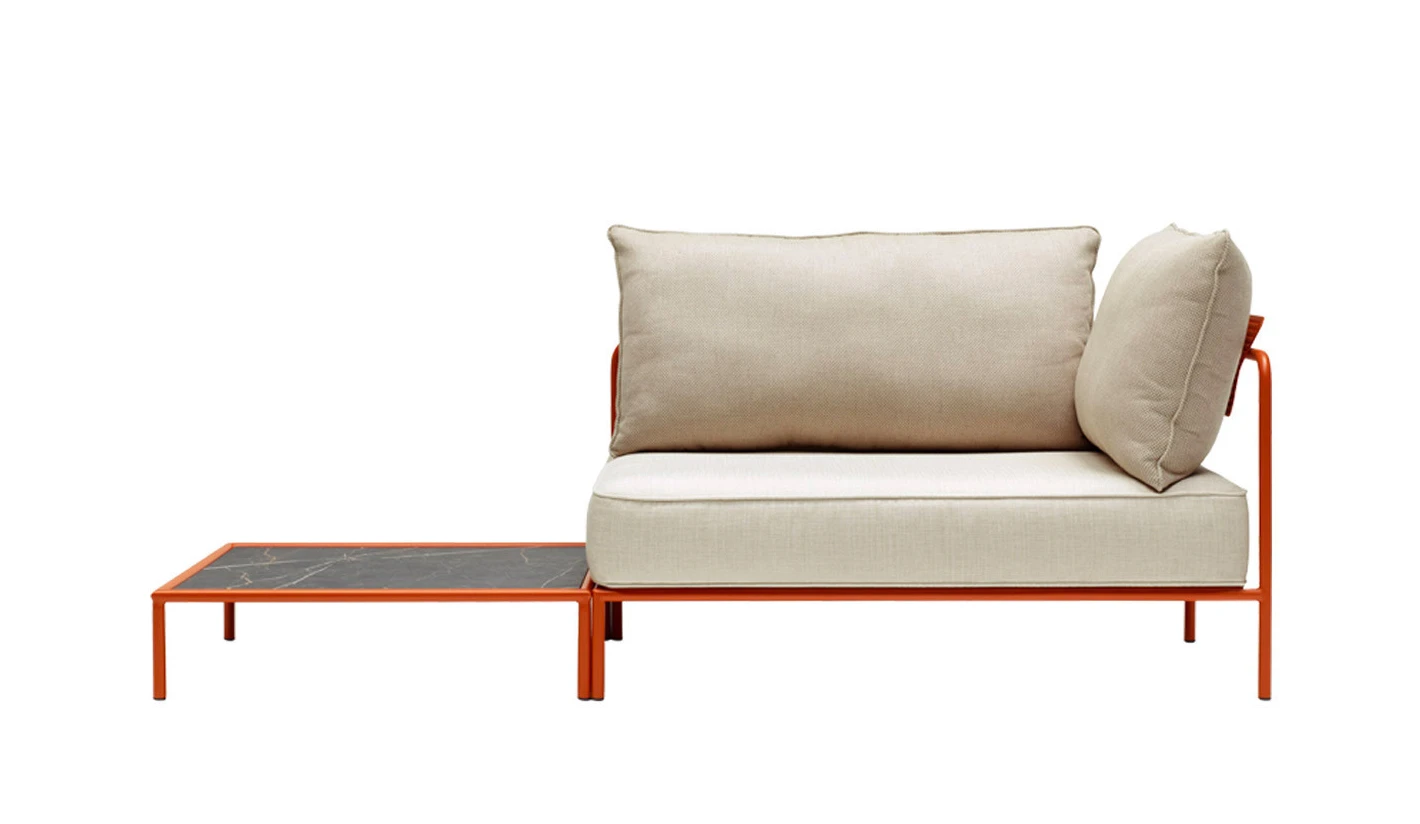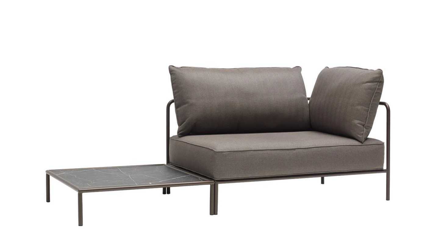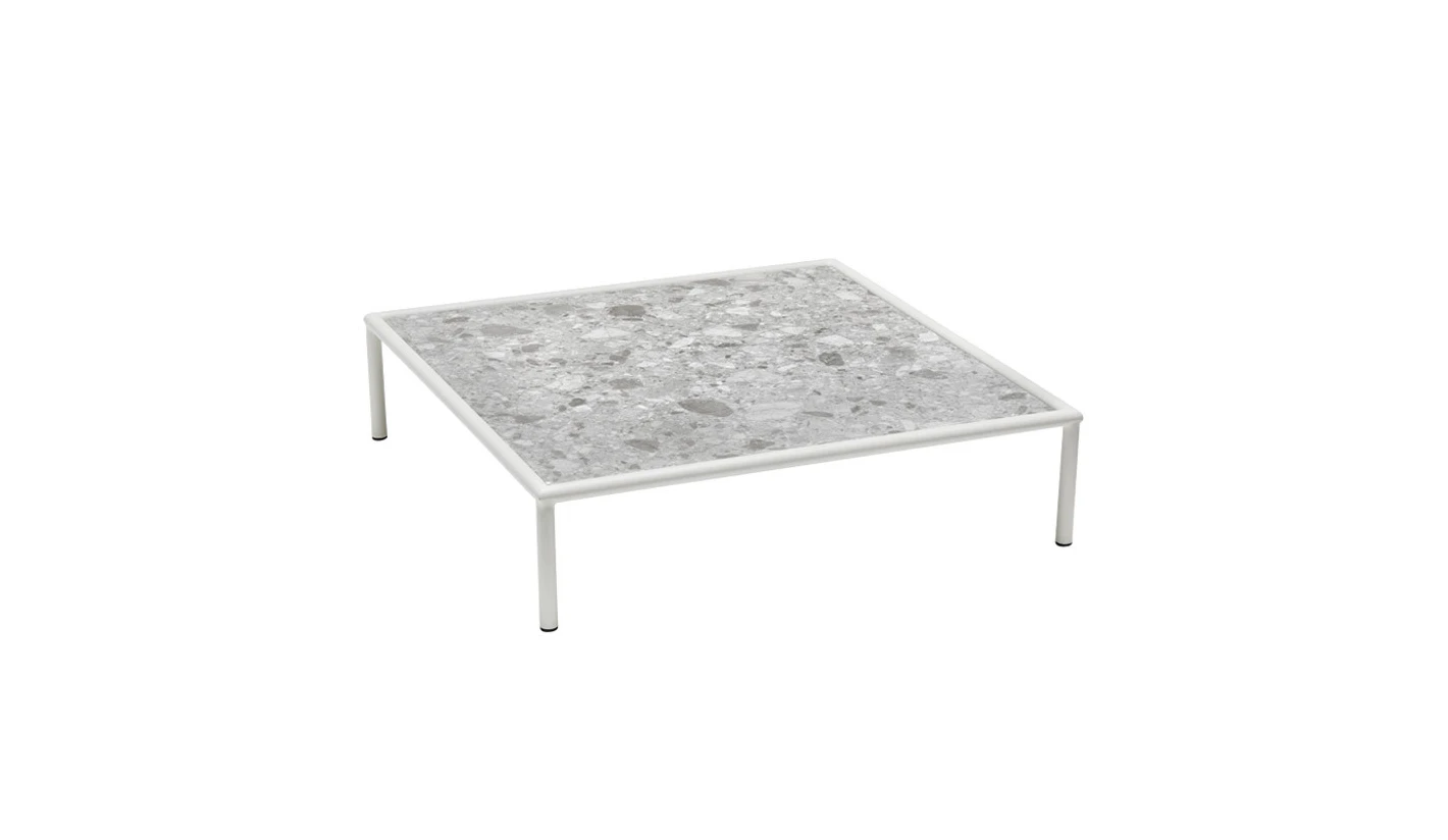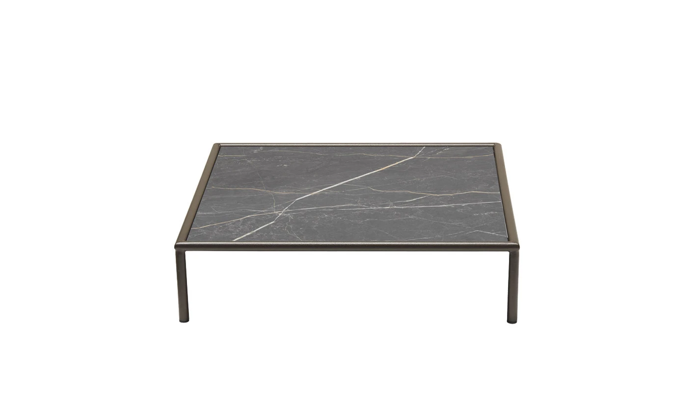 Mesita de centro en compacto HPL con estructura de acero totalmente para el exterior.
