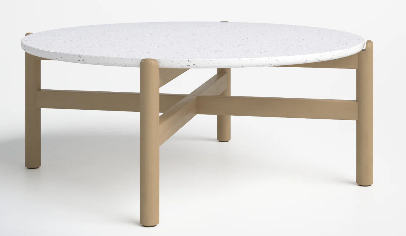 Esta mesa redonda de jardín presenta un diseño contemporáneo y minimalista, ideal para complementar una variedad de estilos decorativos exteriores. La base está construida con madera de eucalipto de tono claro, lo que proporciona una sólida estabilidad y durabilidad adecuada para su uso al aire libre. La superficie de la mesa es notablemente distintiva, compuesta por un material de cerámico blanco, incrustado con pequeños fragmentos en tonos neutros, lo que le confiere un aspecto elegante y fácil de combinar con cualquier mobiliario exterior.