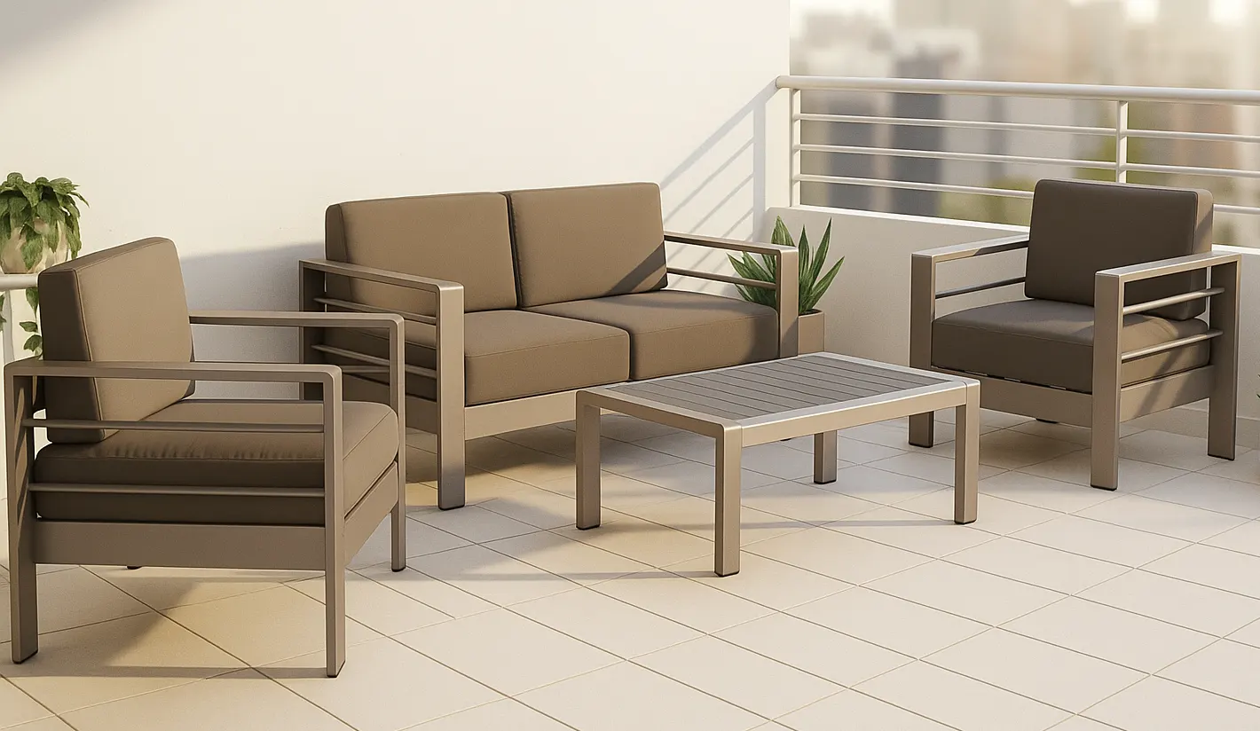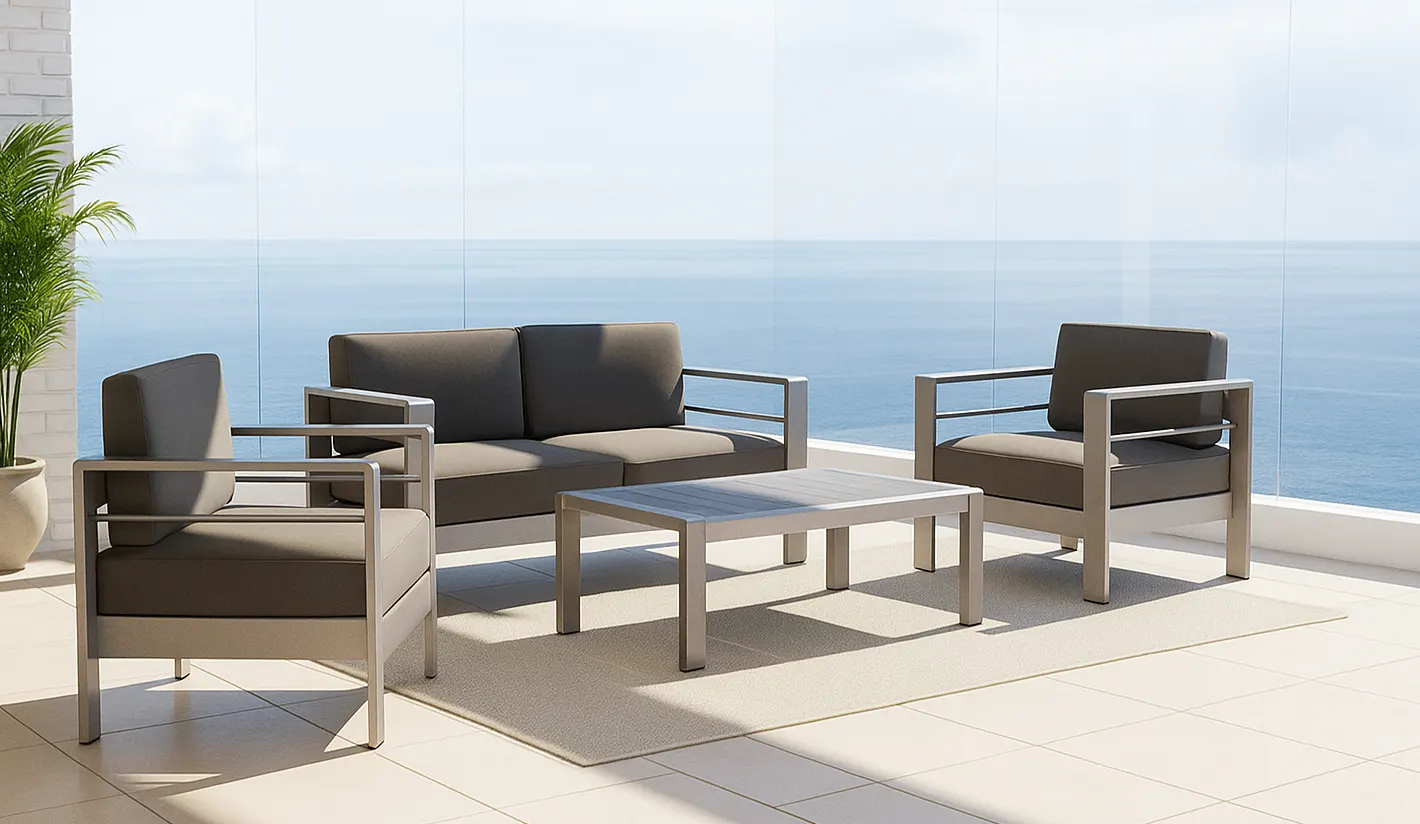 Conjunto formado por un sofá de terraza de dos plazas, 2 sillónes de 1 plaza y una mesa centro de café. Acabado todo en un look de acero inoxidable con la estructura de aluminio anodizado, produciendo efecto de cepillado o brushed en la estructura.