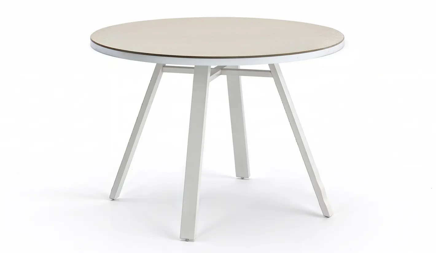 Mesa terraza redonda blanca con sobre cerámico