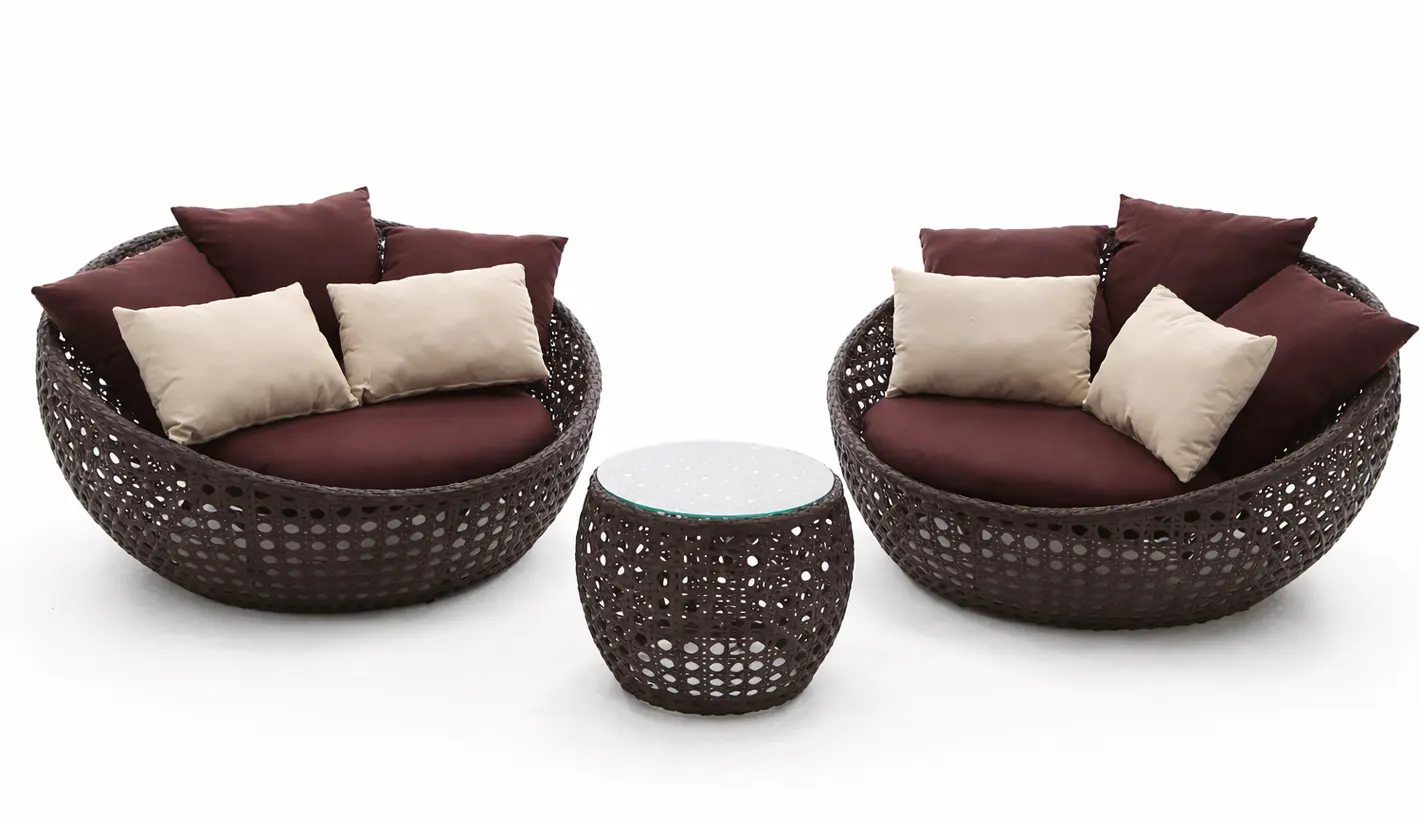 Los sillones tipo nido presentan una estructura sólida de aluminio, un material ligero, inoxidable y altamente resistente a la intemperie. Su acabado se reviste con rattan sintético de alta calidad, trenzado a mano, que aporta un aspecto natural y elegante sin renunciar a la durabilidad. Este rattan es resistente al sol, la humedad y los cambios de temperatura, manteniendo su forma y color con el paso del tiempo.