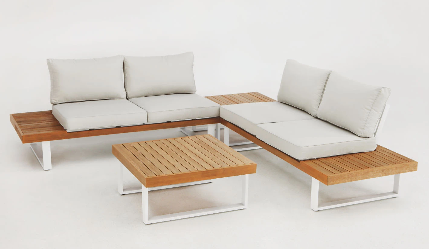 Set de exterior completo en aluminio, con base de madera de Eucalypto.