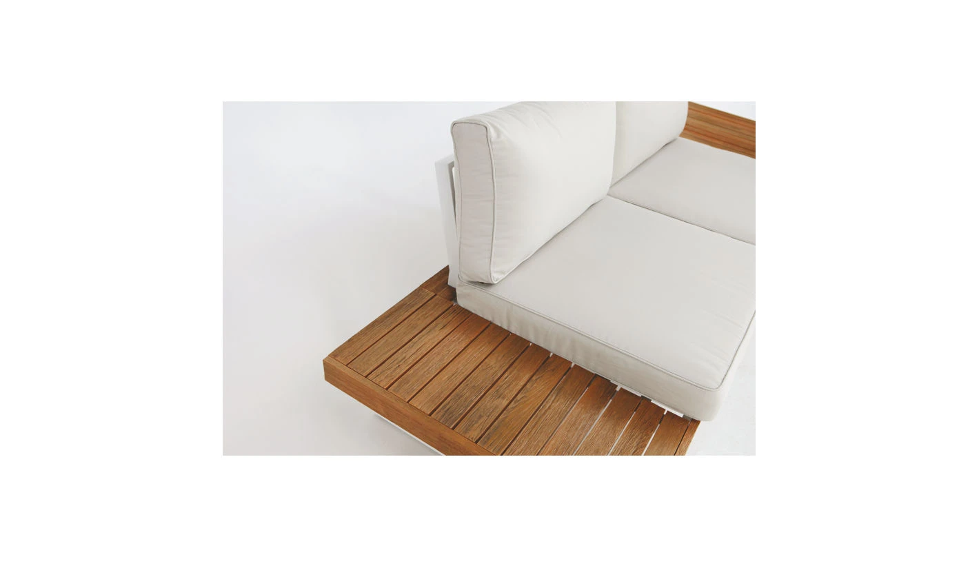 Muebles totalmente para el exterior, con cojines acrílicos en color gris claro, que combinados con el color madera, y el blanco de la estructura de aluminio proporcionan calidez al jardín.