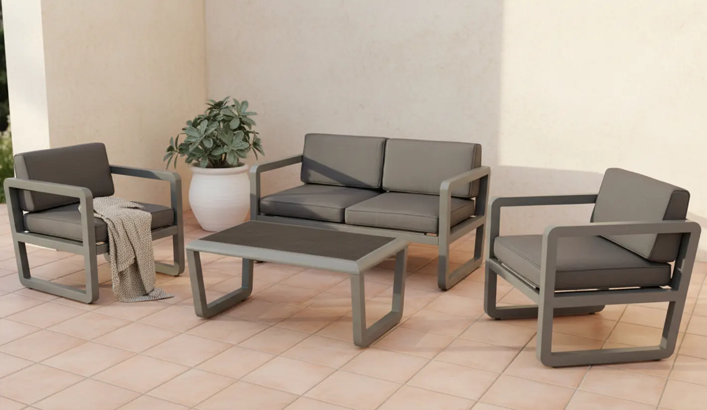 Compuesto por dos sillones individuales, un sofá de dos plazas y una mesa de centro, este conjunto combina estilo moderno, resistencia y comodidad, ideal para crear un ambiente sofisticado y duradero al aire libre.