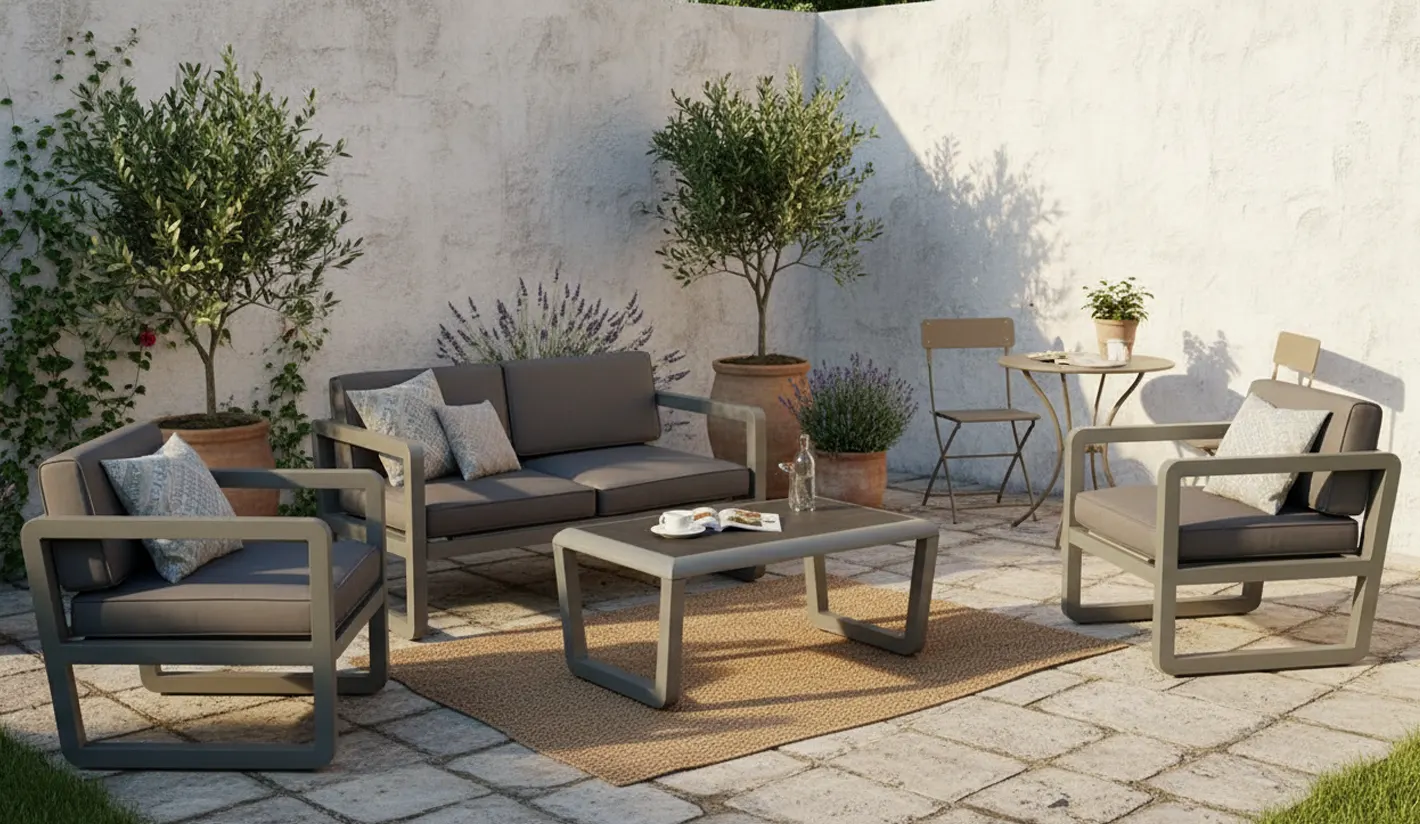Elegante set de muebles de jardín de aluminio color gris, perfecto para terrazas, patios y zonas de exterior.