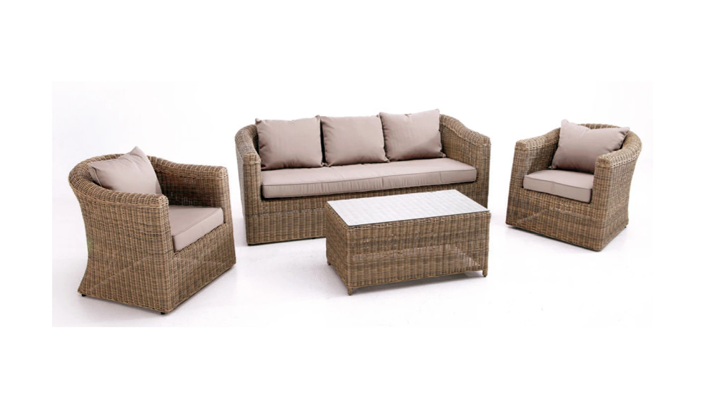 El conjunto incluye sofás y sillones amplios y confortables, acompañados de una mesa de centro con superficie lisa, ideal para apoyar bebidas, libros o elementos decorativos. Los cojines acolchados en tono taupé, diseñados para exterior, proporcionan una sentada cómoda y ergonómica, manteniendo su forma y color con el uso.
