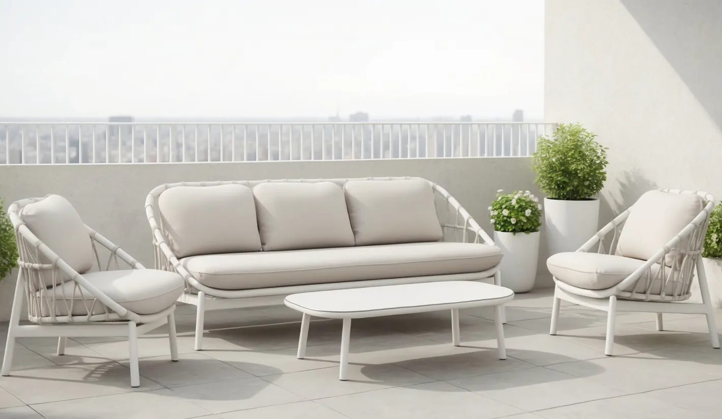 Estructura de aluminio en color blanco con asiento y respaldo de cuerda en color natural, creando una combinación muy elegante, 100% resistente al exterior.