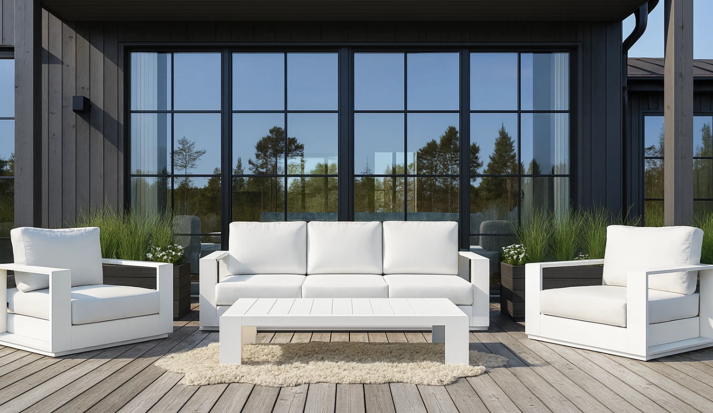 Blanco integral tanto en la estructura como en los cojines, aportando una estética limpia y moderna que se adapta fácilmente a distintos estilos de terrazas, jardines o porches. -