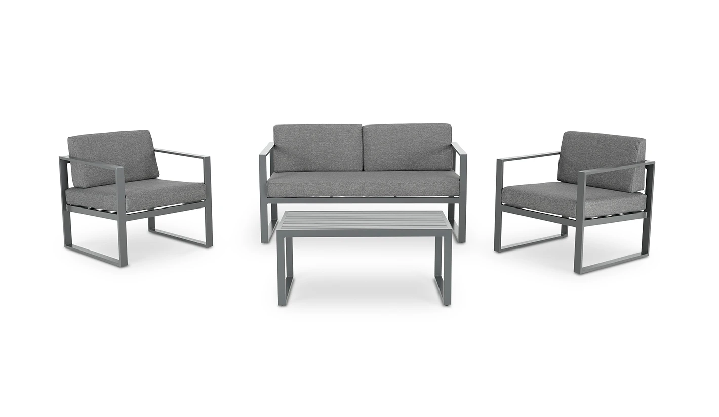 Set de jardín moderno de aluminio anodizado, disponible en dos colores elegantes: blanco o antracita, ideal para terrazas, patios o zonas chill out. Este conjunto incluye 2 sillones individuales, 1 sofá de 2 plazas y 1 mesa de centro, creando un espacio de descanso sofisticado y resistente al aire libre.
