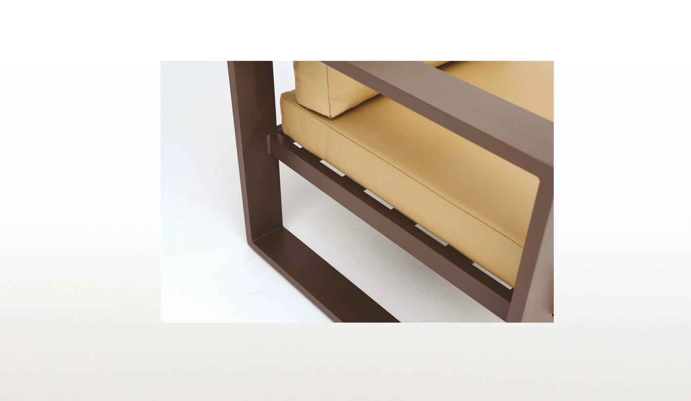 Estructura de aluminio en color marrón y cojines en tejido náutico en color taupé.