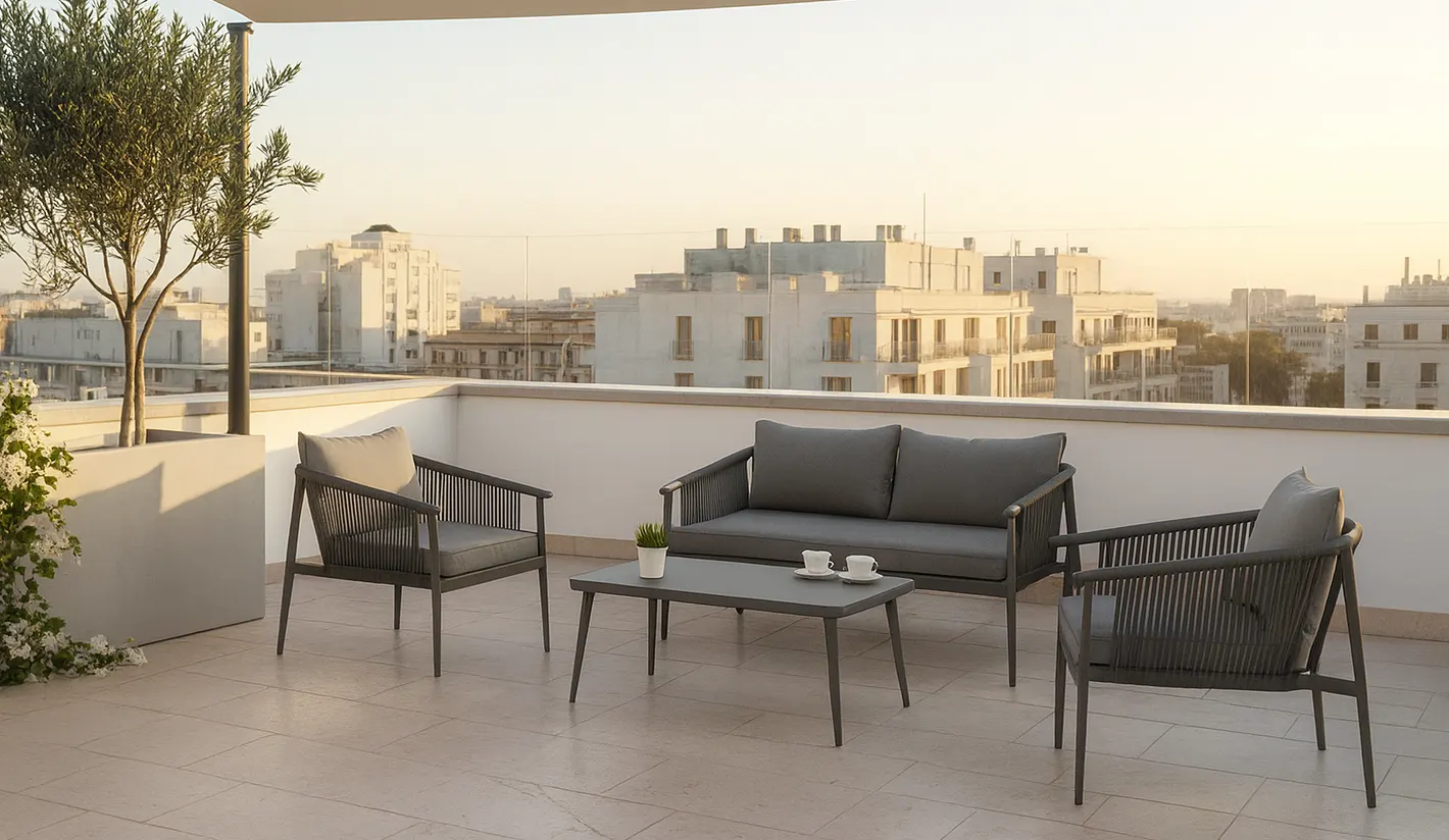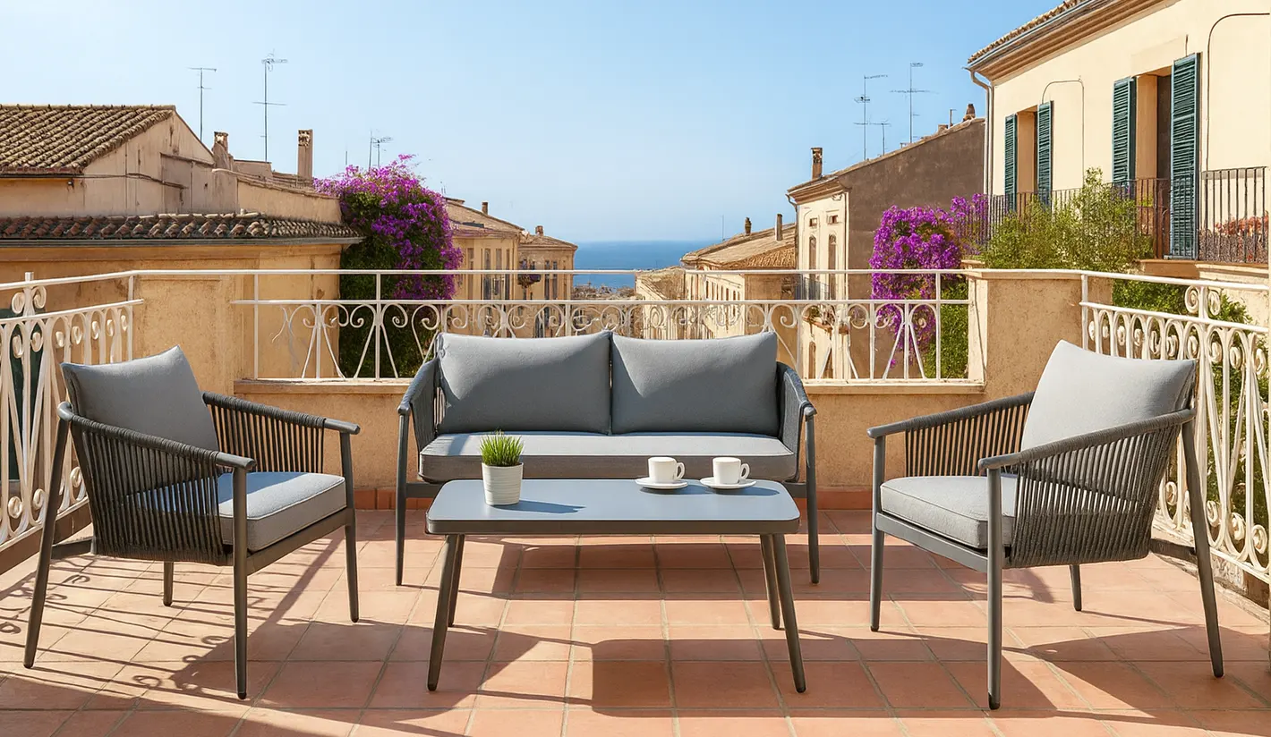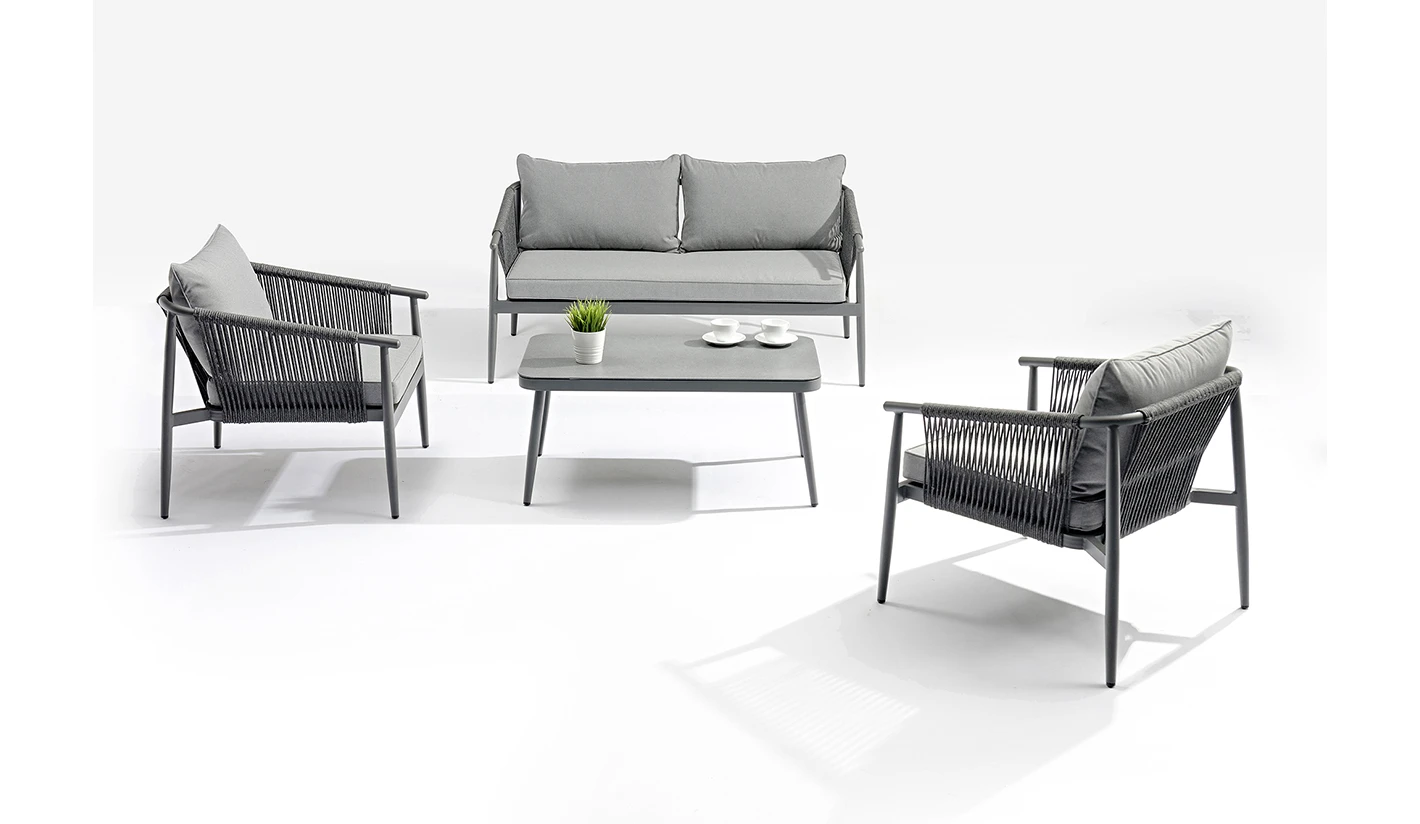 Estructura de aluminio disponible en dos colores: Gris. con tejido de cuerda de Olefin, un tejido acrilico para el exterior muy resistente y con mucha solidez a la luz.