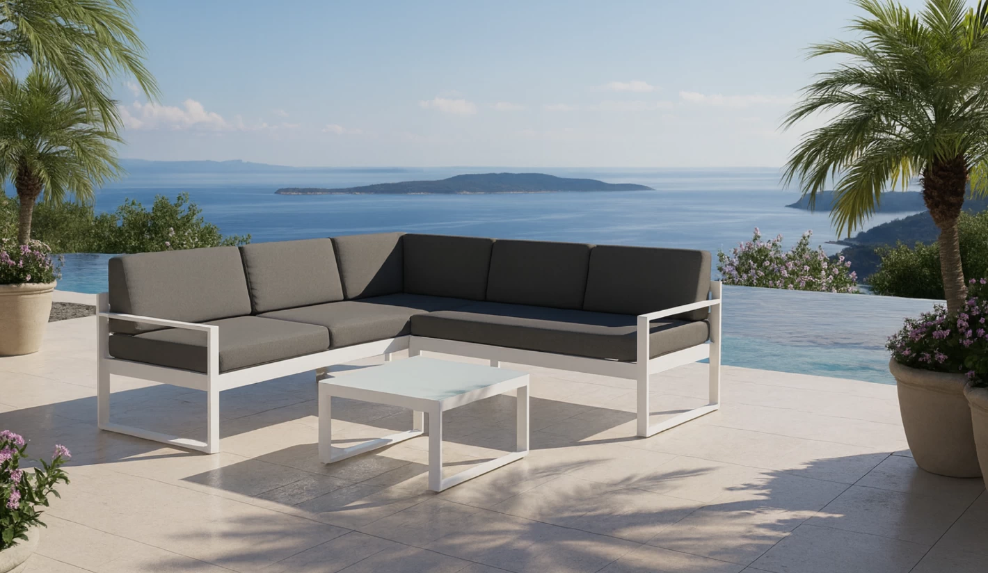 La estructura de este sofá de jardín es de aluminio, que puede ser en color blanco o antracita, y los cojines de asiento y respaldo incluidos son de poliester, totalmente apto para el exterior, de color antracita.