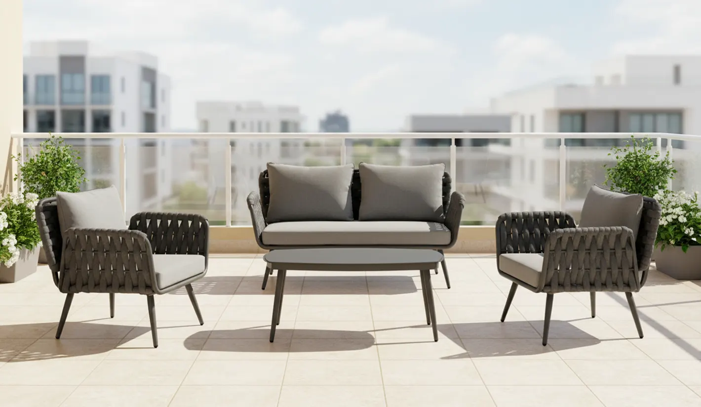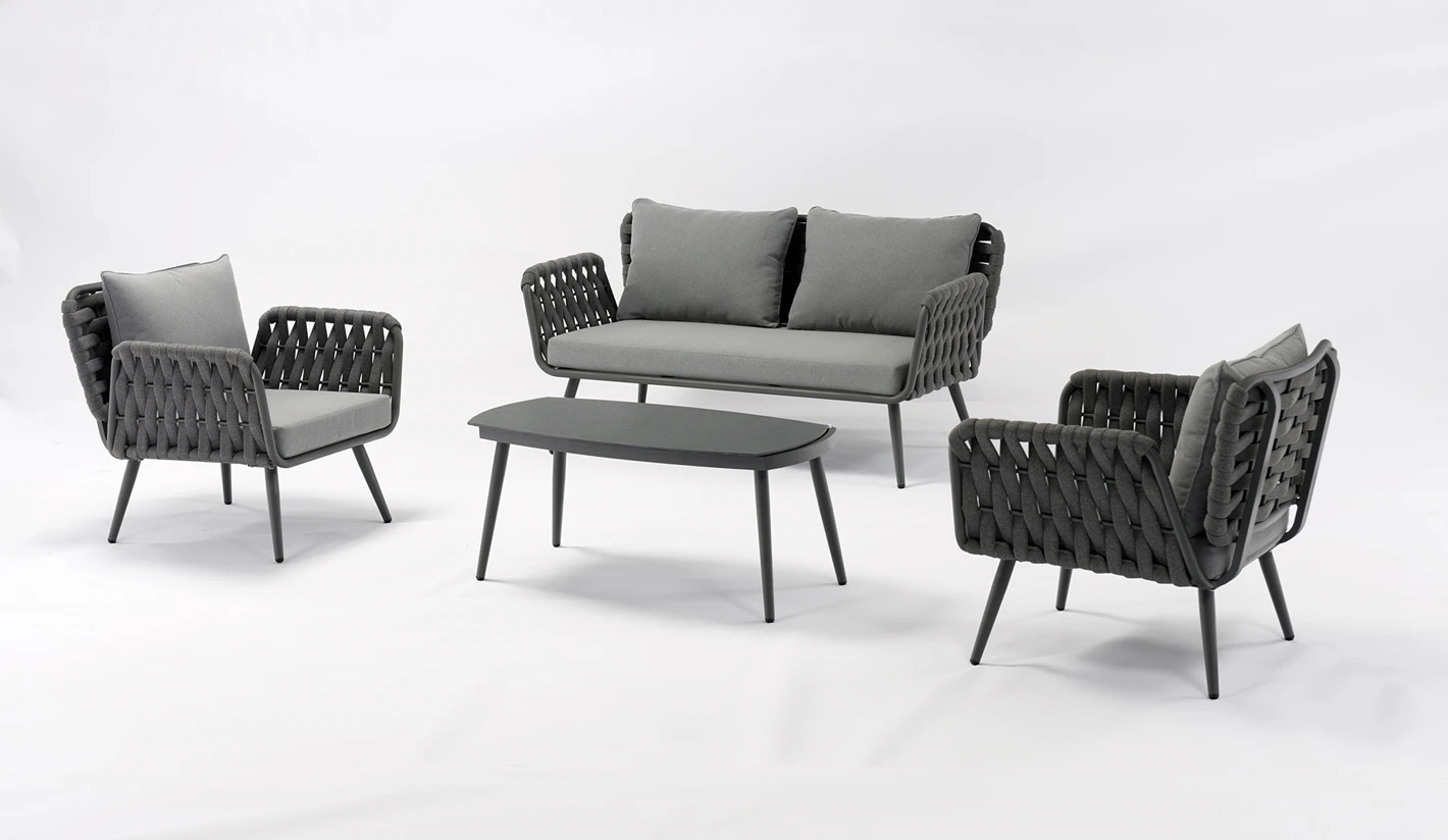 Estructura de aluminio en color gris, con tejido en cuerda de Olefin tambien, en color gris y con goma.