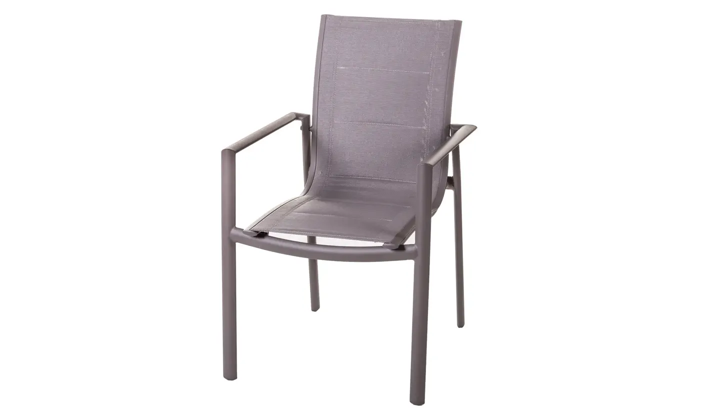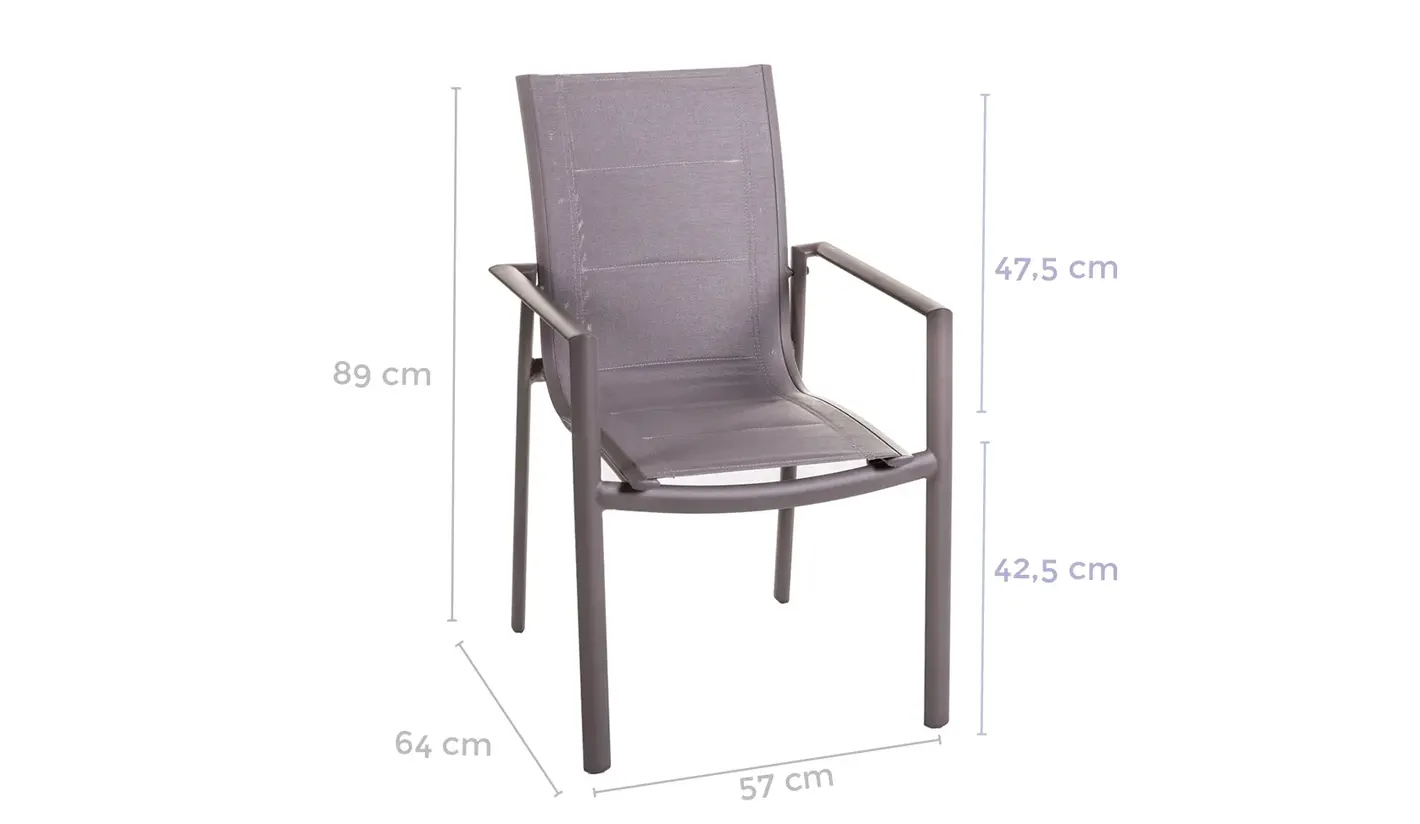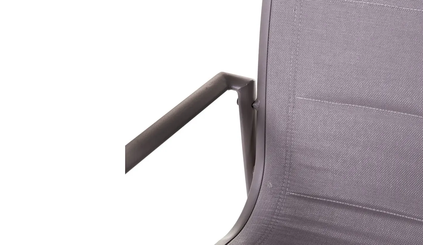 El asiento y respaldo están fabricados en textileno 2x1 con relleno, un material especialmente diseñado para exterior que ofrece una excelente transpirabilidad, se seca rápidamente y proporciona una sentada cómoda incluso en usos prolongados. Además, el relleno aporta un plus de confort frente a las sillas tradicionales de malla.