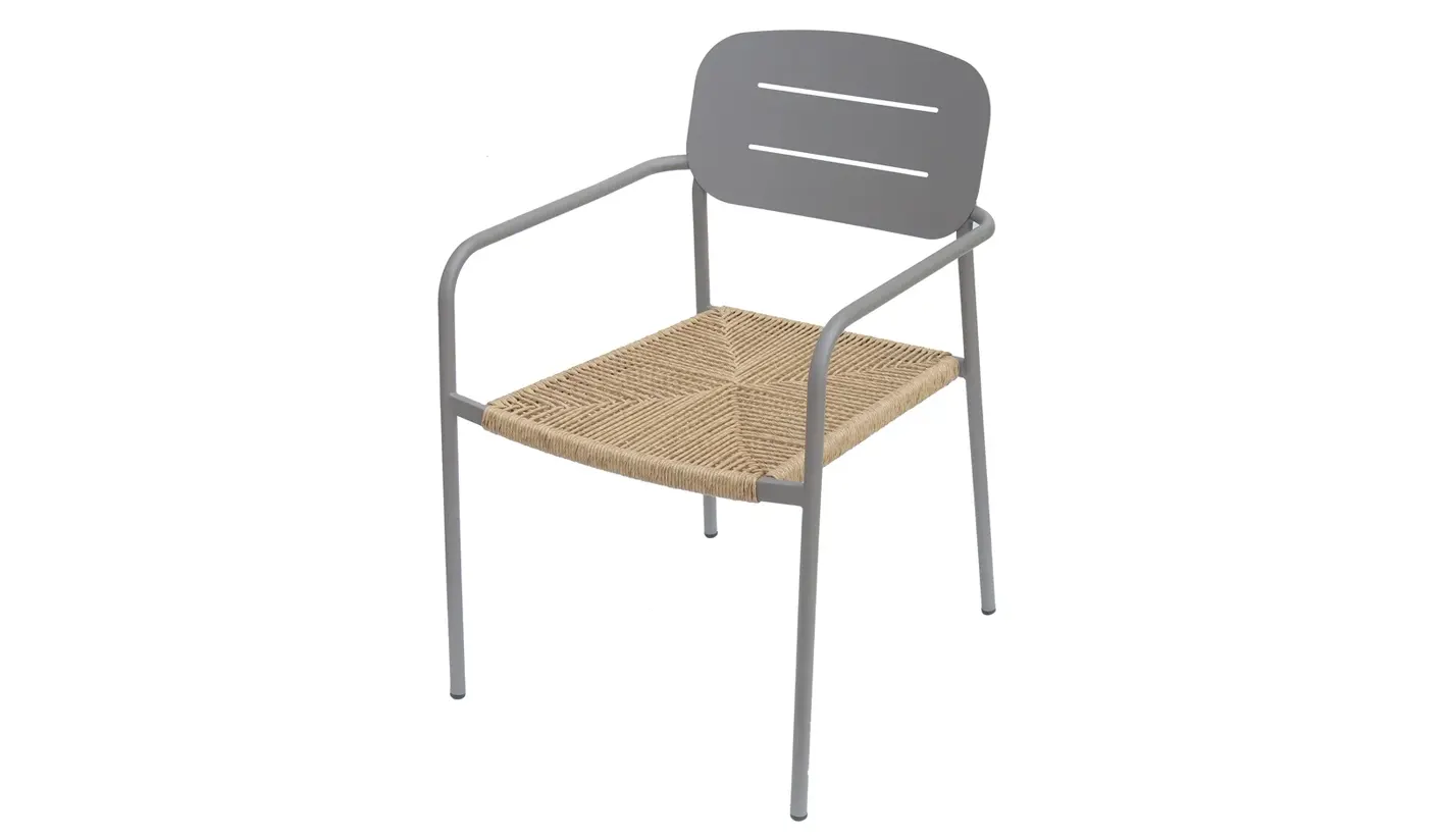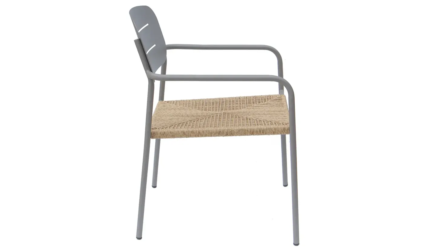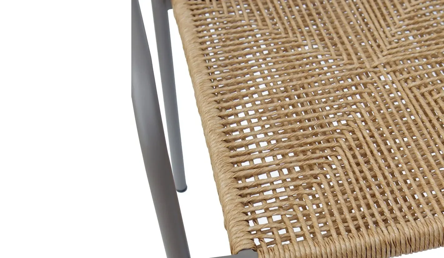 Dale un aire moderno a tu terraza con esta silla de exterior en acero y cuerda trenzada. Su estructura con doble lacado en Epoxy garantiza una gran resistencia frente a la humedad y el sol.