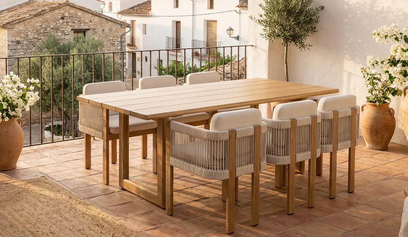 El sillón de jardín de aluminio Sardeña destaca por su diseño cuidado y su carácter artesanal, ideal para particulares que buscan un comedor exterior con personalidad. Su estructura de aluminio imitación madera garantiza durabilidad y estabilidad, manteniendo una estética cálida y actual.