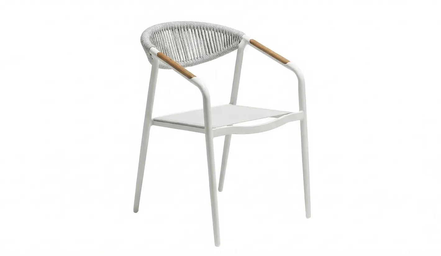 Gracias a la combinación de acabados neutros y materiales versátiles, la silla VENTURI encaja con facilidad en terrazas, porches, jardines y comedores de estilo moderno, mediterráneo o contemporáneo.